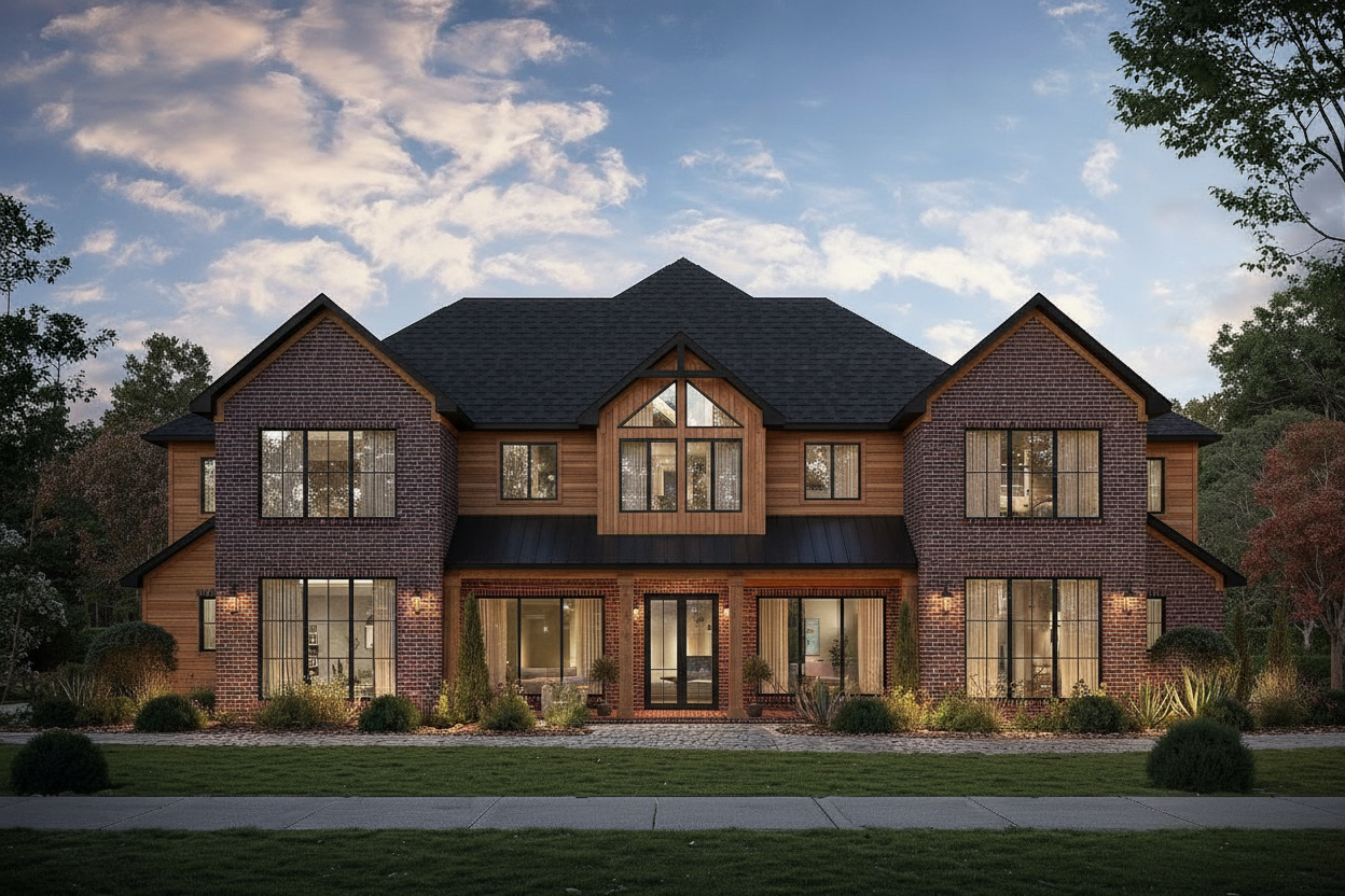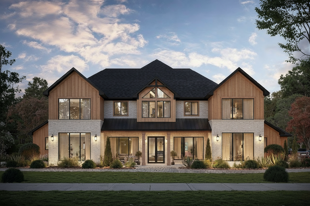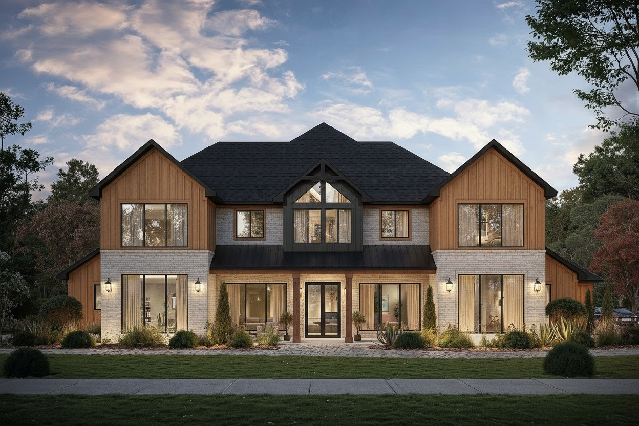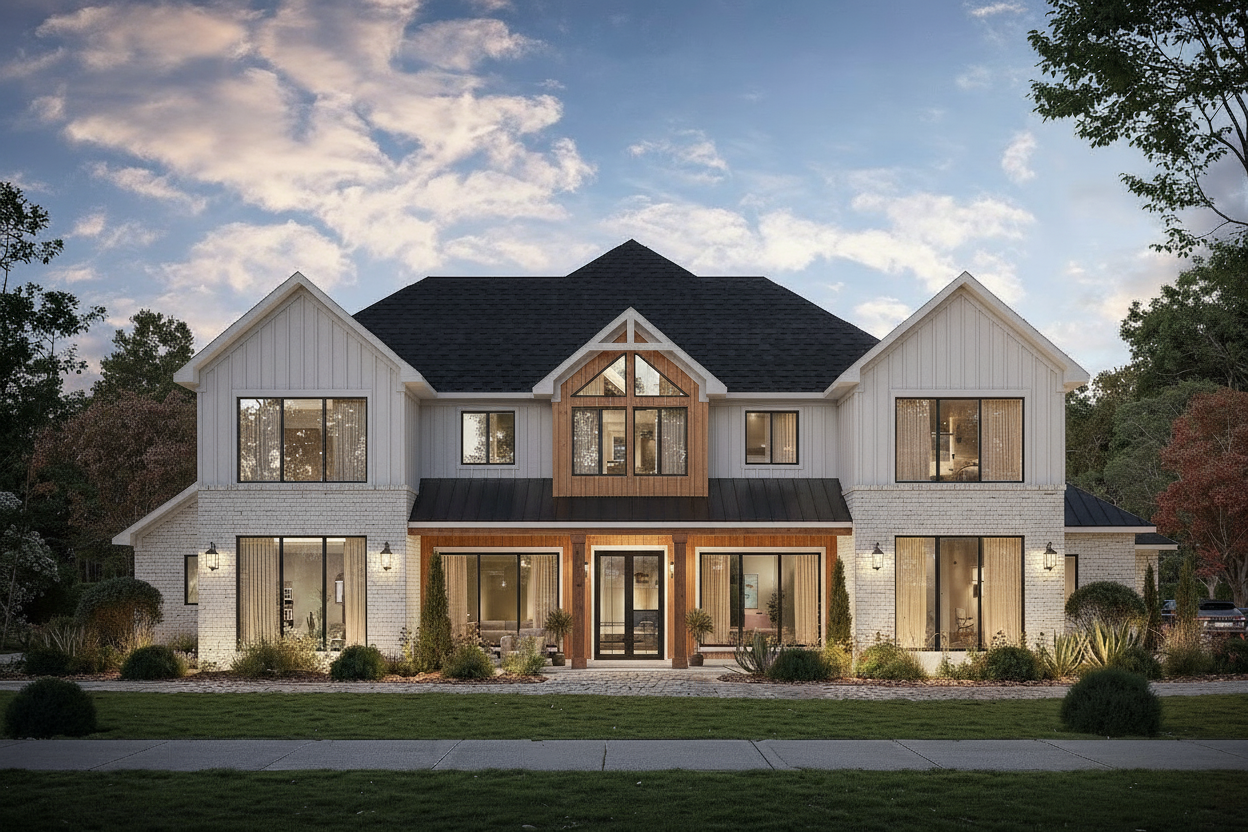 change exterior to a transitional modern organic style with white and black colors do not change the structure