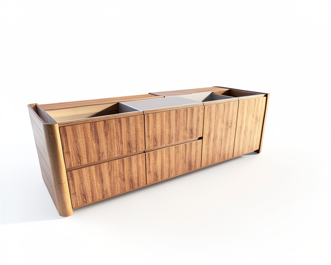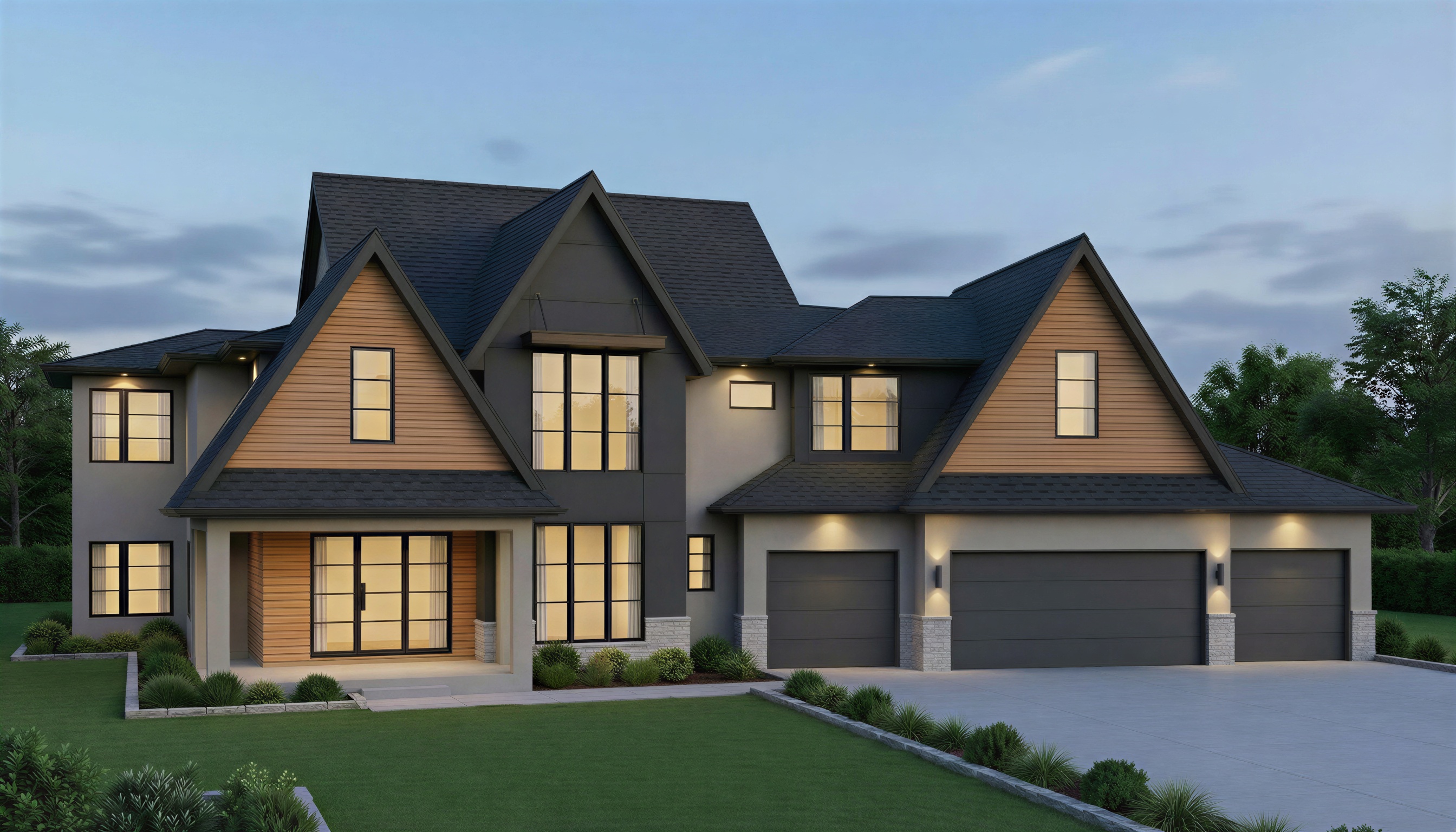 change the color of the bump out section surrounding the center double garage door to charcoal gray match the tone to a deep modern charcoal similar to sherwin williams iron ore maintain existing lighting shadows texture and material realism do not alter any other siding trim stone garage doors or surrounding elements preserve the evening lighting and overall rendering quality