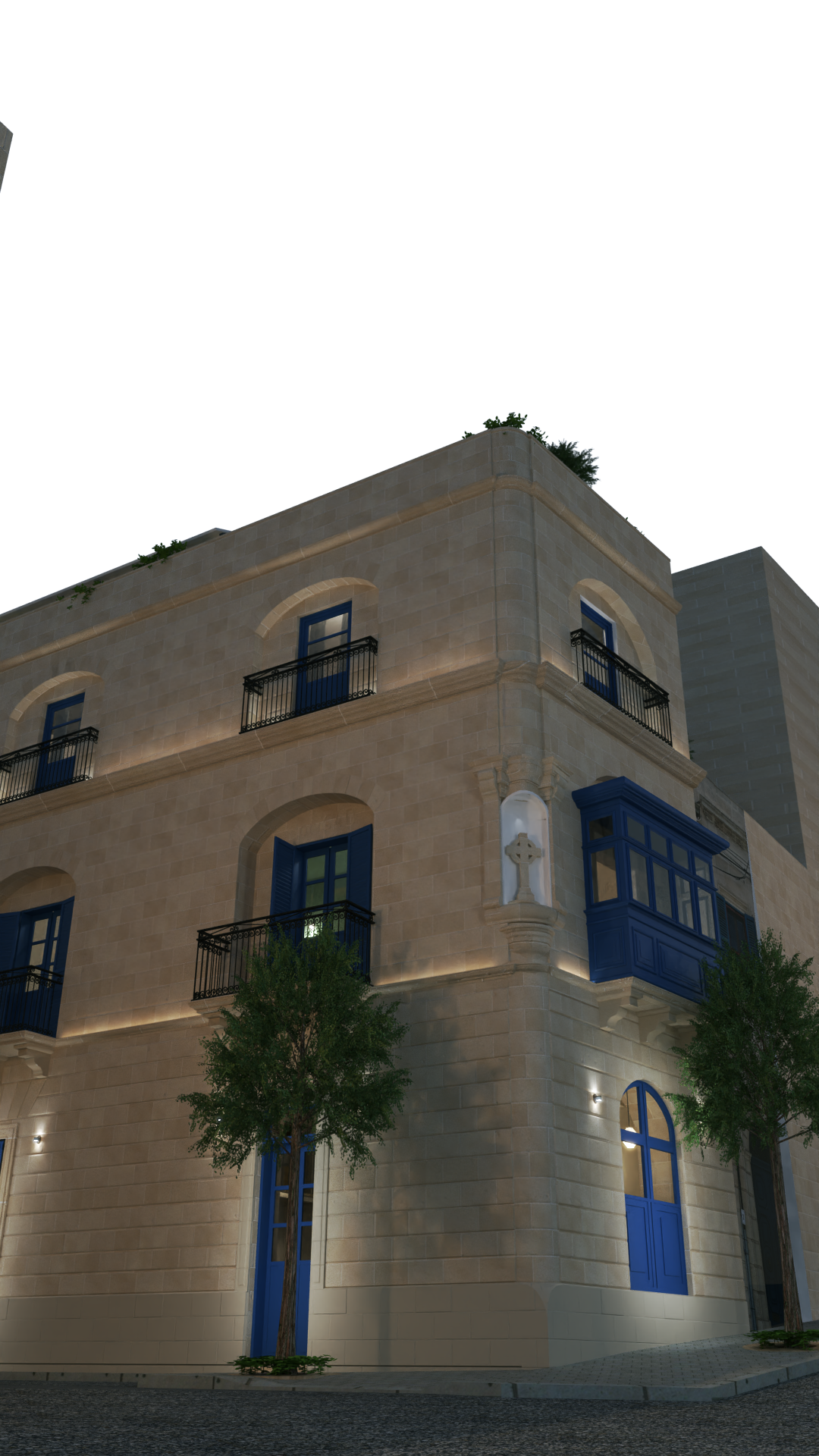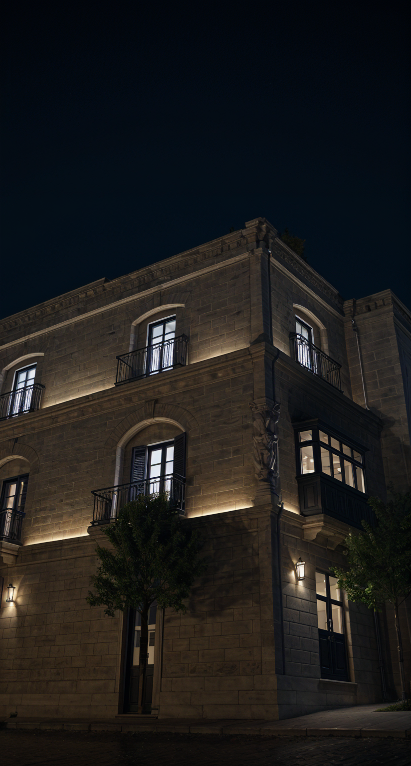 make it more realistic night version retain black railing at the terraces blue all apertures add few people background moon and stars
