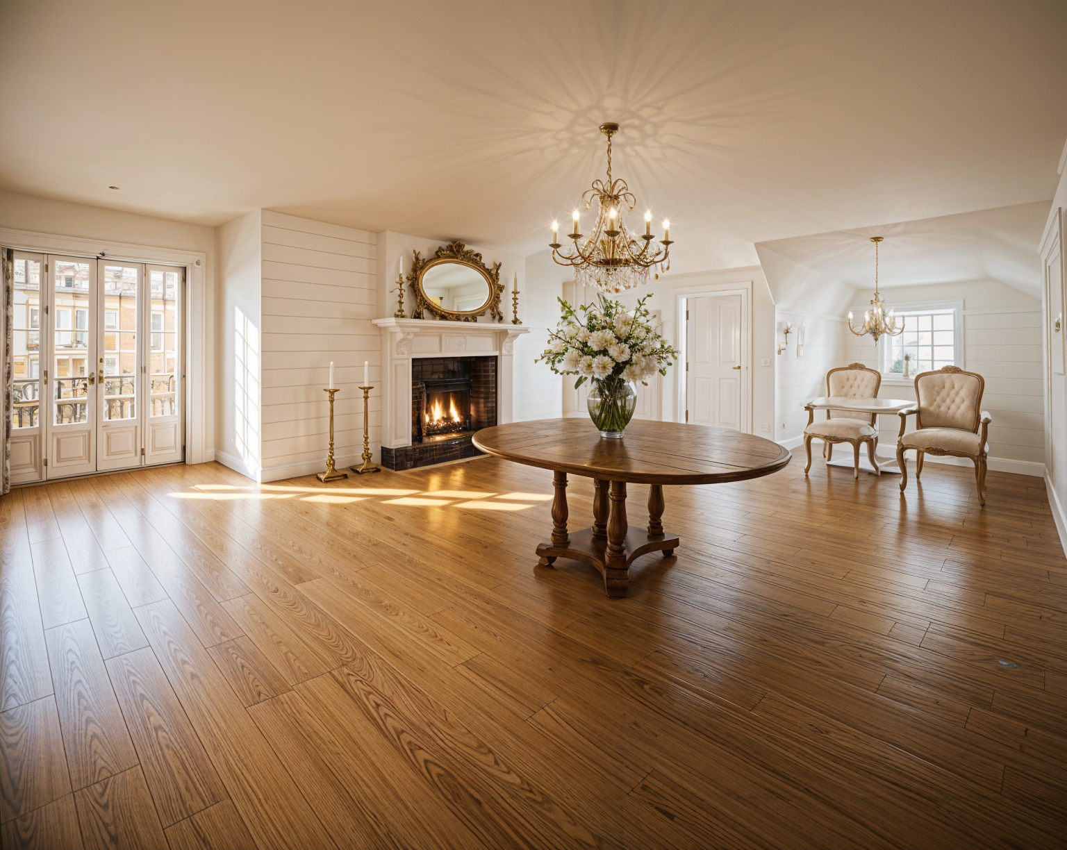 make the view beyond the french doors an interior wedding reception hall with white tables and wooden chairs keep everything else the same