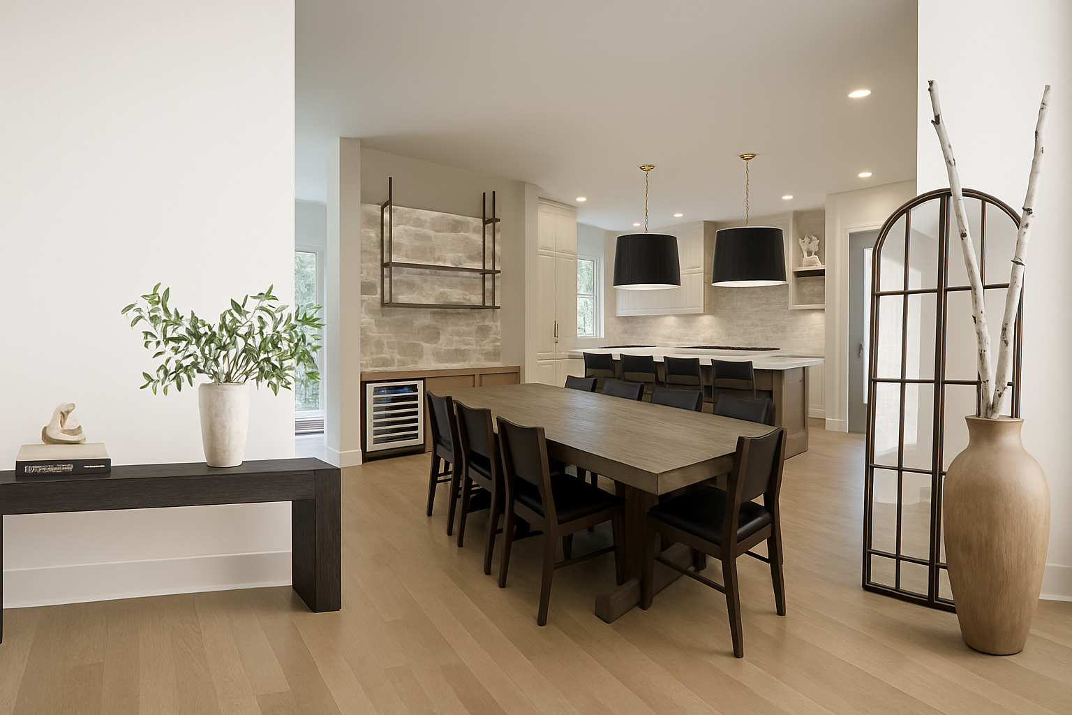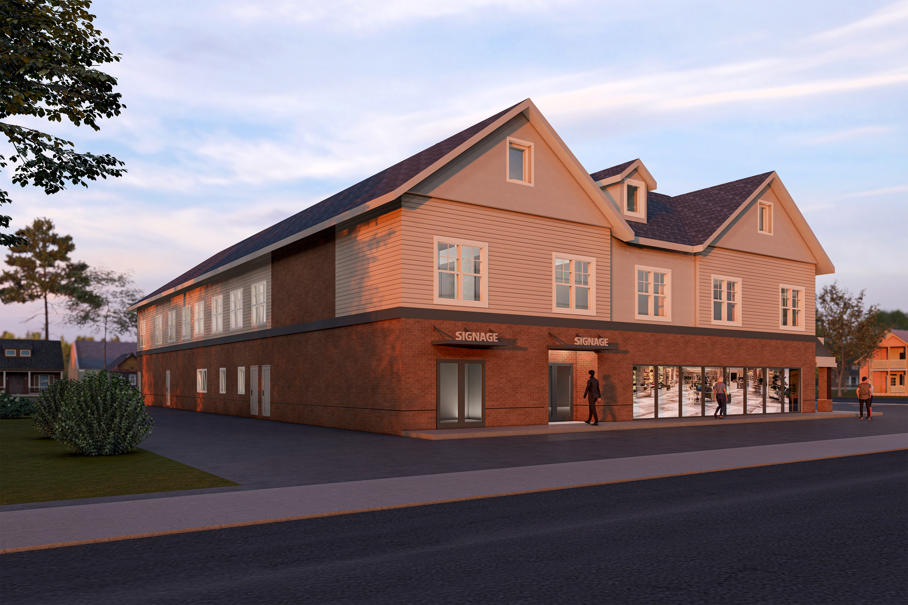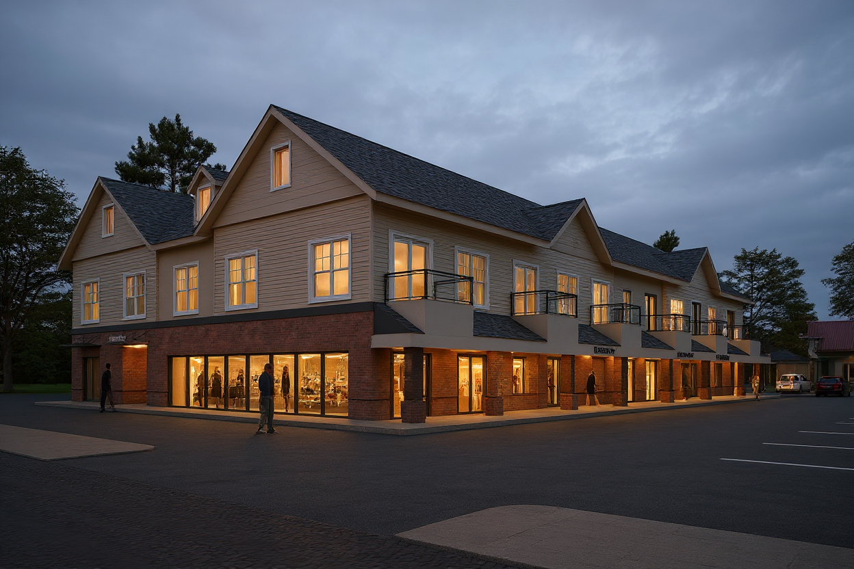 render keeping the volume colors textures and create a dynamic and lively picture with people cars lights coming form inside the building summer vibe