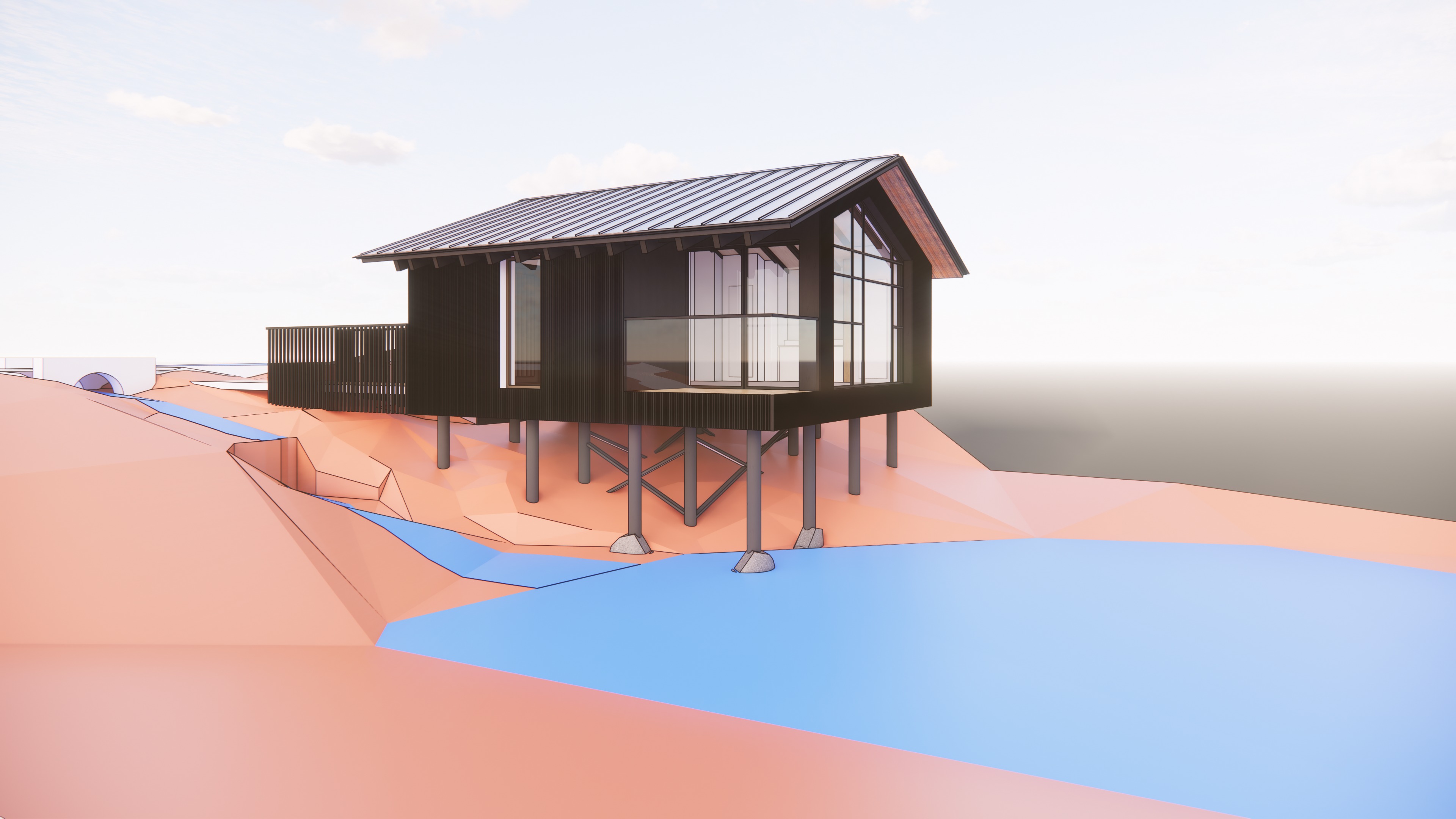 maintain the light to see the details under the roof wal material black burned wood posts ground of a forest pond roof is pigmento brown mantein geometry