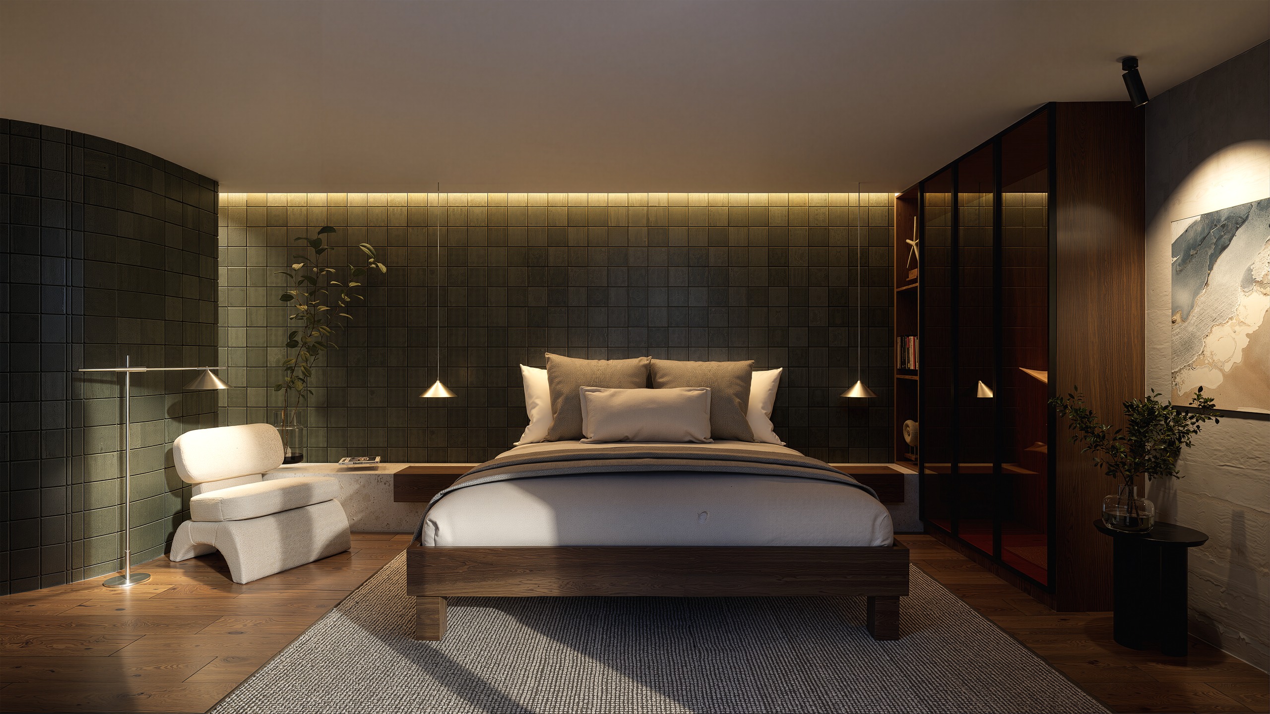 a high end photorealistic interior photograph of a 4 stars hotel bedroom an architect focus on extreme photorealism and tactile surfaces emphasize rich deep textures fiber details in fabrics natural grain and imperfections in wood realistic patina and specular highlights on metallic surfaces subsurface scattering on leaves and stone the surfaces show microscopic imperfections subtle wear and realistic reflections cinematic color grading highly detailed 8k resolution architectural digest style photography shot on 35mm lens