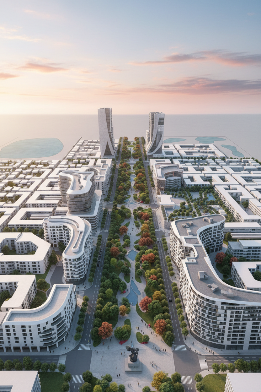 make the buildings around the boulevard to be more mediterranean make the background to keep goin all the way to the end the place in the middle cars can go through it so remove the statue in the middle remove the cars that are in the linear park in the middle can i get a street view to see how it would feel walking through the boulevard