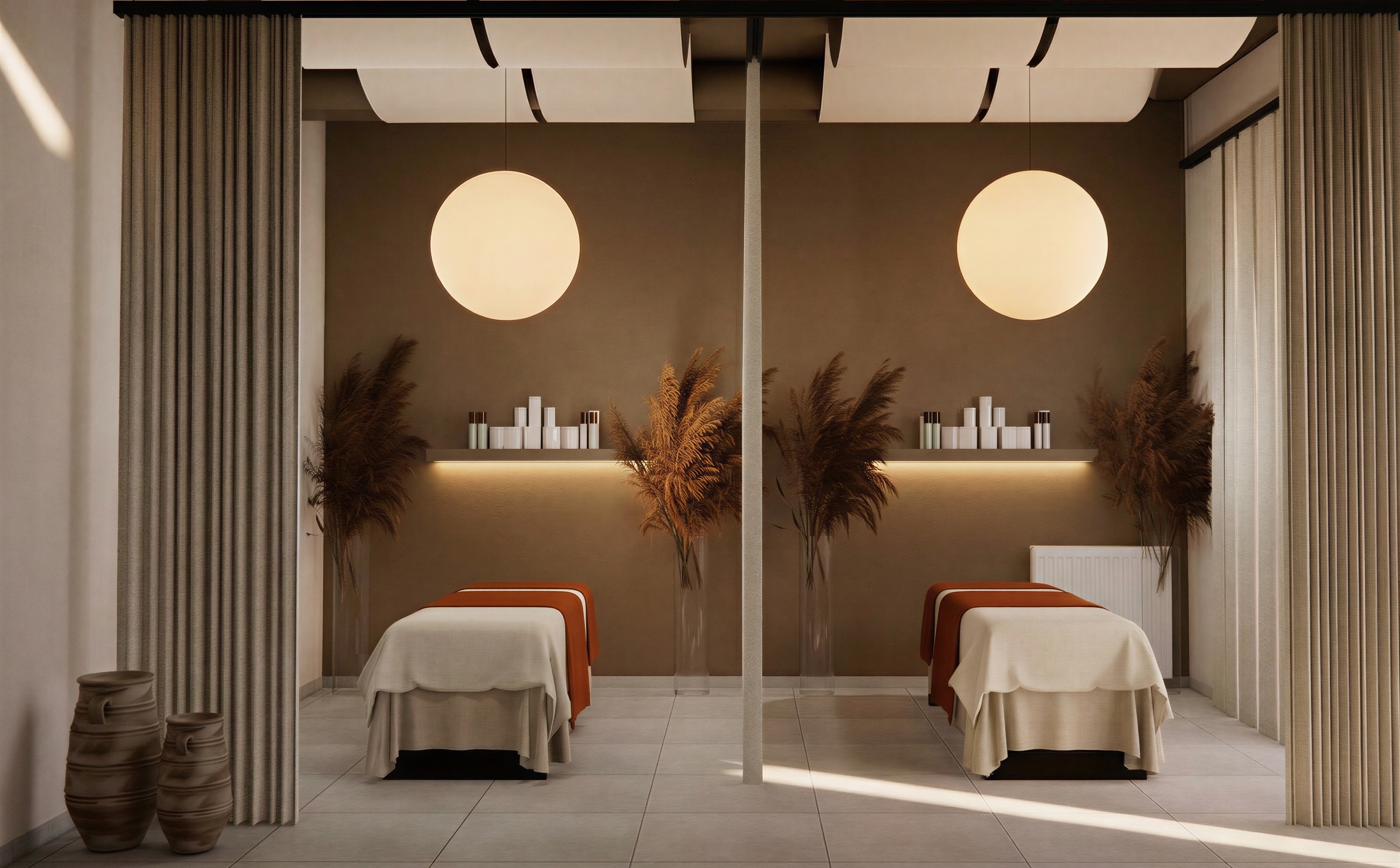 ultra realistic interior of a boho style massage room warm and natural atmosphere hand woven textiles light natural wood bamboo details tropical plants monstera palms linen curtains subtle macram wall decor soft diffused daylight coming through a window complemented by warm rattan pendant lamps realistic lighting natural shadows and reflections inside the room are two thai massage therapists adult women with a natural professional appearance they wear traditional elegant thai massage uniforms in neutral tones beige ecru olive one therapist is performing a massage on a fully clothed client lying on a massage table non sexual professional while the second therapist is calmly preparing massage oils nearby natural poses authentic interaction peaceful and professional spa atmosphere photorealistic quality high material detail skin fabric wood correct human proportions realistic scale depth of field like professional interior photography luxury spa mood cinematic realism 8k global illumination soft shadows real interior photo style