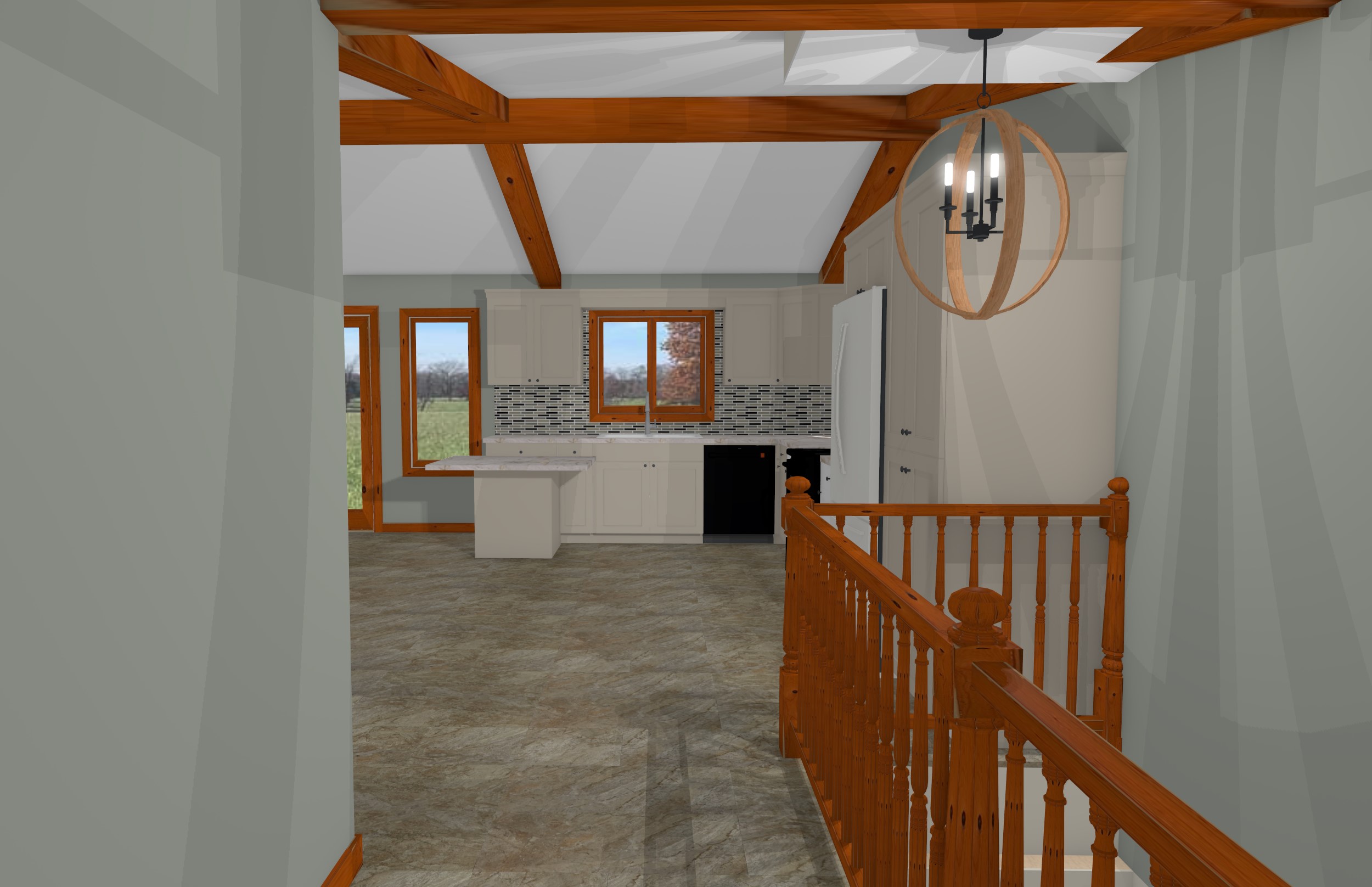 make this image a photograph the cabinets are sherwin williams accessible beige the flooring is mannington adura vinyl tile century size 12 x 24 in the color pebble with a dark grout the wood work is a wamr natrual tone and the walls are sherwin williams oyster bay