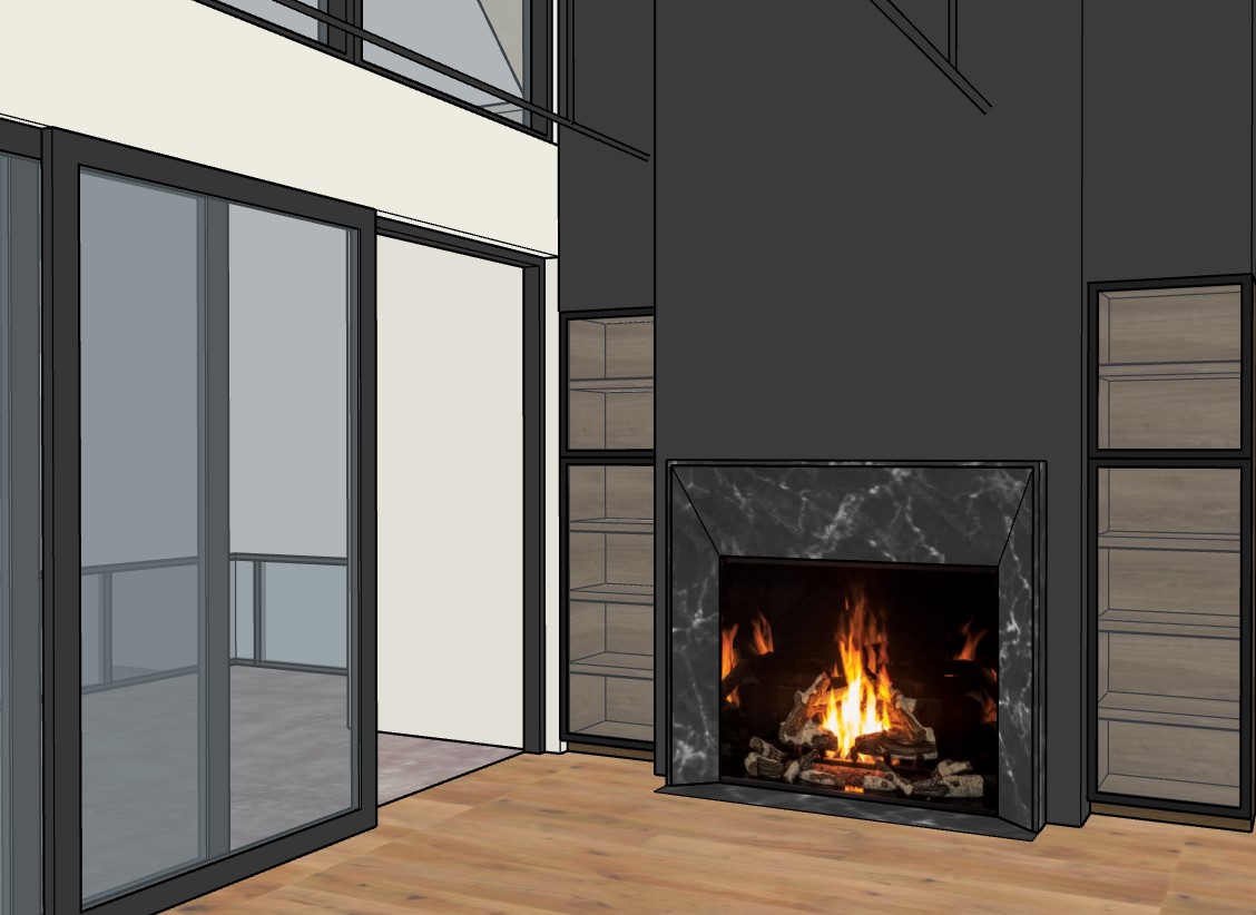 add lighting beneath each shelf add trees and mountains outside make it photorealistic