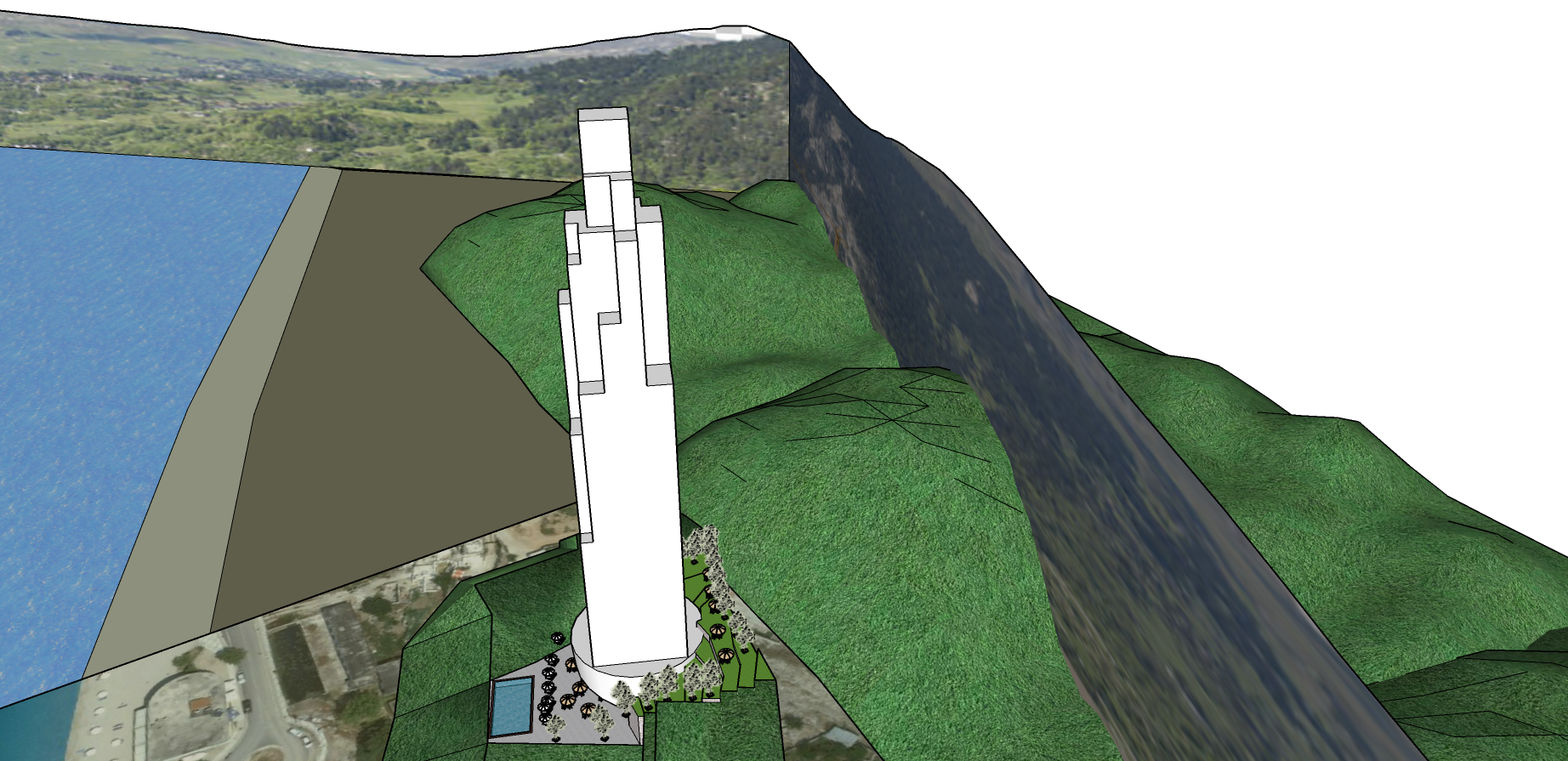 contemporary exterior shot render an architectural resort resembling a lighthouse nestled in lush green mountains featuring cascading terraces with modern structures in white tones put large tall and wide glass doors overlooking the terraces and also many windows in all the walls windows and doors have to prevail over the facade and they need to be not uniformly aligned in vertical each terrace is adorned with vibrant green lawns and elegant parasols in soft beige the surrounding trees are a mix of muted silver and deep green foliage incorporate a luxurious inviting pool at the base with clear blue water the atmosphere exudes tranquility and harmony with nature with soft natural lighting emphasizing the serene setting please fill the surrounding hills with olive trees and some houses make it an elite residential zone architecture there is the sea on the left of the picture