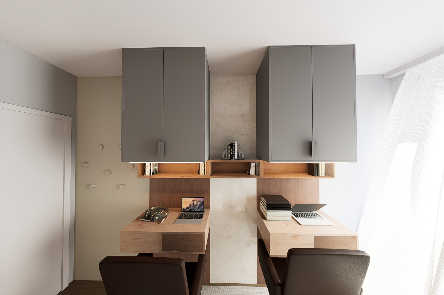 ultra realistic interior render enhancement preserve exact camera angle centered composition symmetry proportions and full layout do not modify geometry furniture placement wall positions or cabinet dimensions enhance materials and realism only upper cabinets smooth matte lacquer finish in elegant warm grey tone ultra clean edges soft light absorption no gloss wood elements desks shelves premium warm walnut tone with rich natural grain subtle tonal variation matte satin finish back wall panel refined stone or microcement texture soft natural variation matte finish high end subtle look chairs dark leather upholstery with soft sheen fine stitching realistic cushioning styling keep it minimal and symmetrical add curated books and a few refined decorative objects on shelves balanced left right composition keep both desks clean and premium maintain symmetry no random clutter lighting soft natural daylight from right side through sheer curtain diffused and balanced add subtle warm led under cabinet shelf lighting for depth clean global illumination soft shadows no harsh contrast slight warm tone to enhance wood materials rendering quality ultra photorealistic high resolution sharp material definition and realistic shadows slight depth of field do not change symmetry desk alignment cabinet positions or spacing do not redesign anything only enhance materials lighting and realism