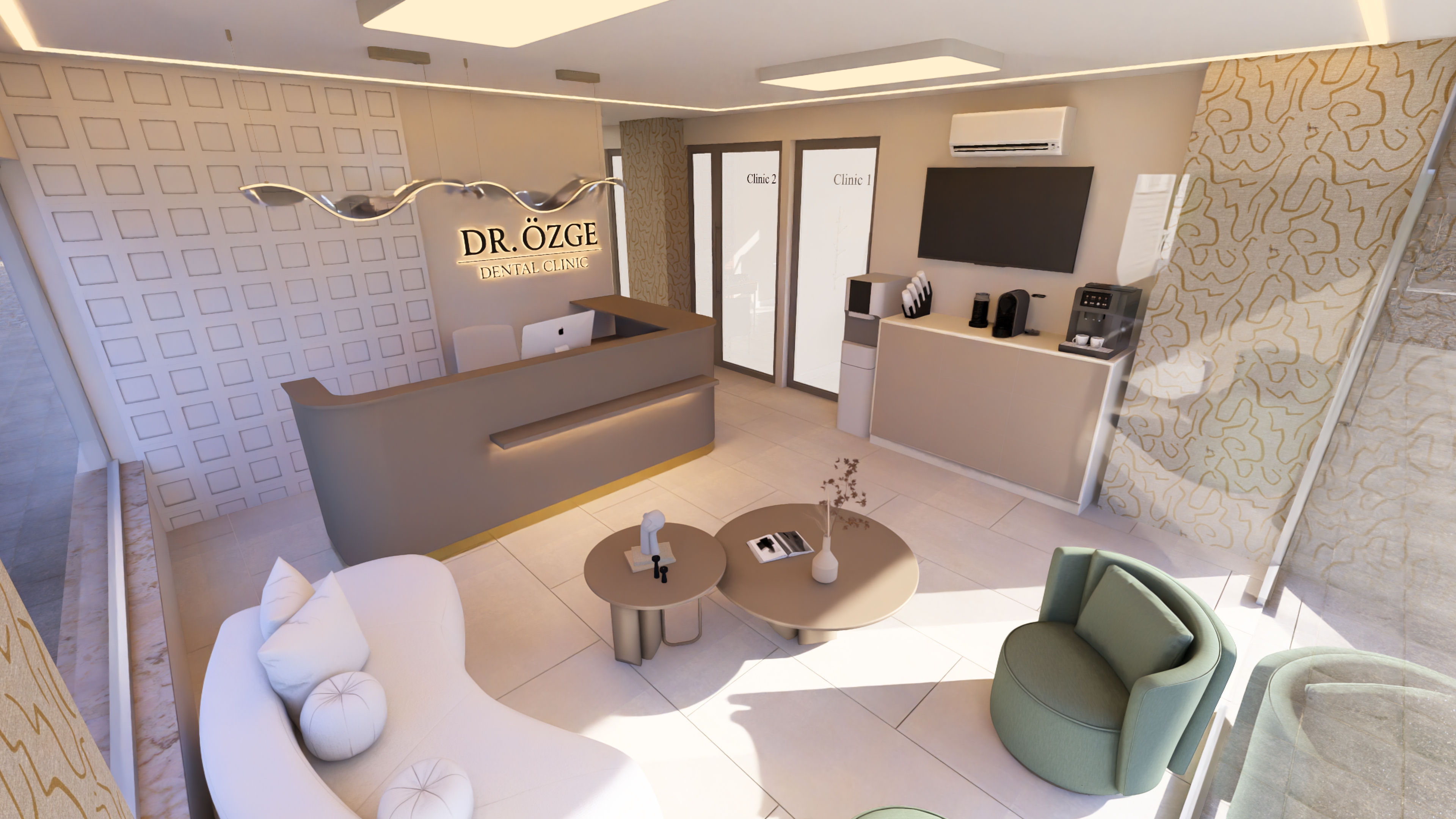 a welcoming dental clinic reception area that feels soft luxurious and clean