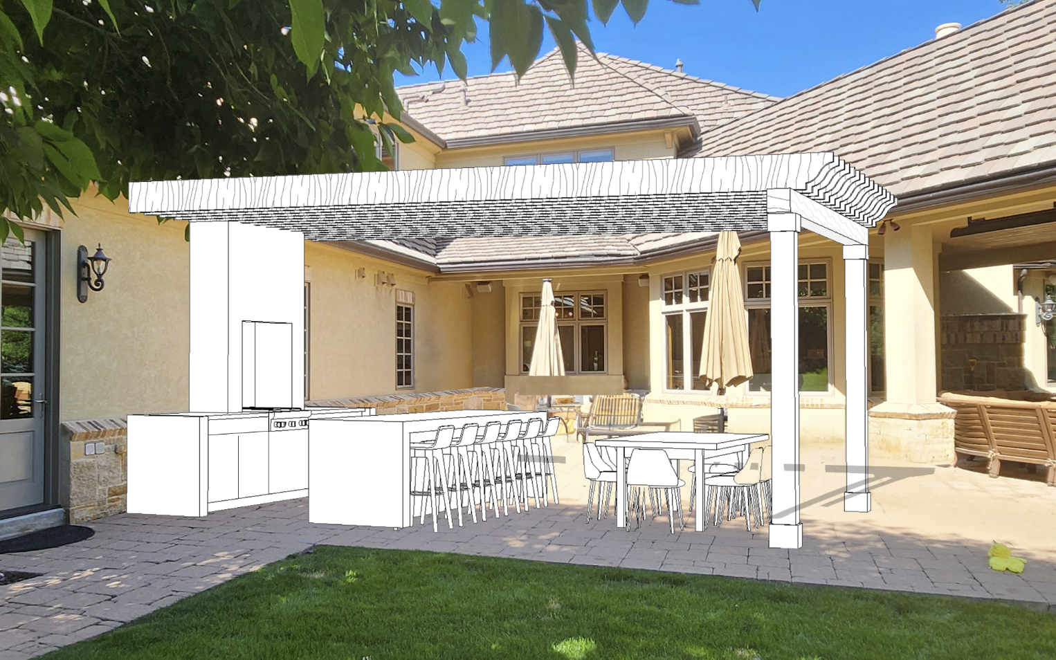 make stucco very light tan pavers to be darker gray chimney to match surrounding stone wood columns and horizontal trellis members
