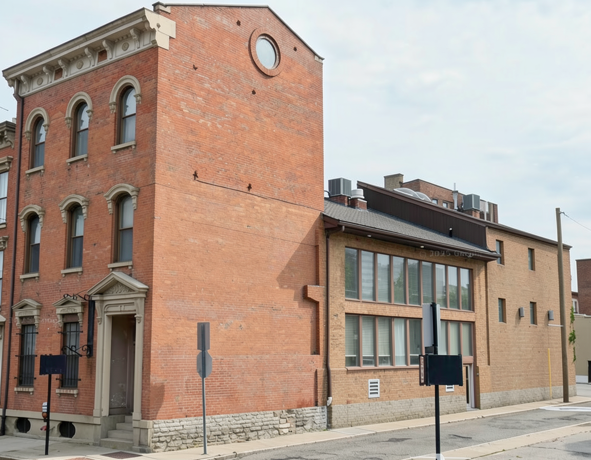strict maintain exact building geometry massing proportions openings materials and camera perspective from the input image critical only modify the side rear elevation area highlighted in the red box do not change anything outside of this area existing structure protection preserve all existing red brick exactly as is