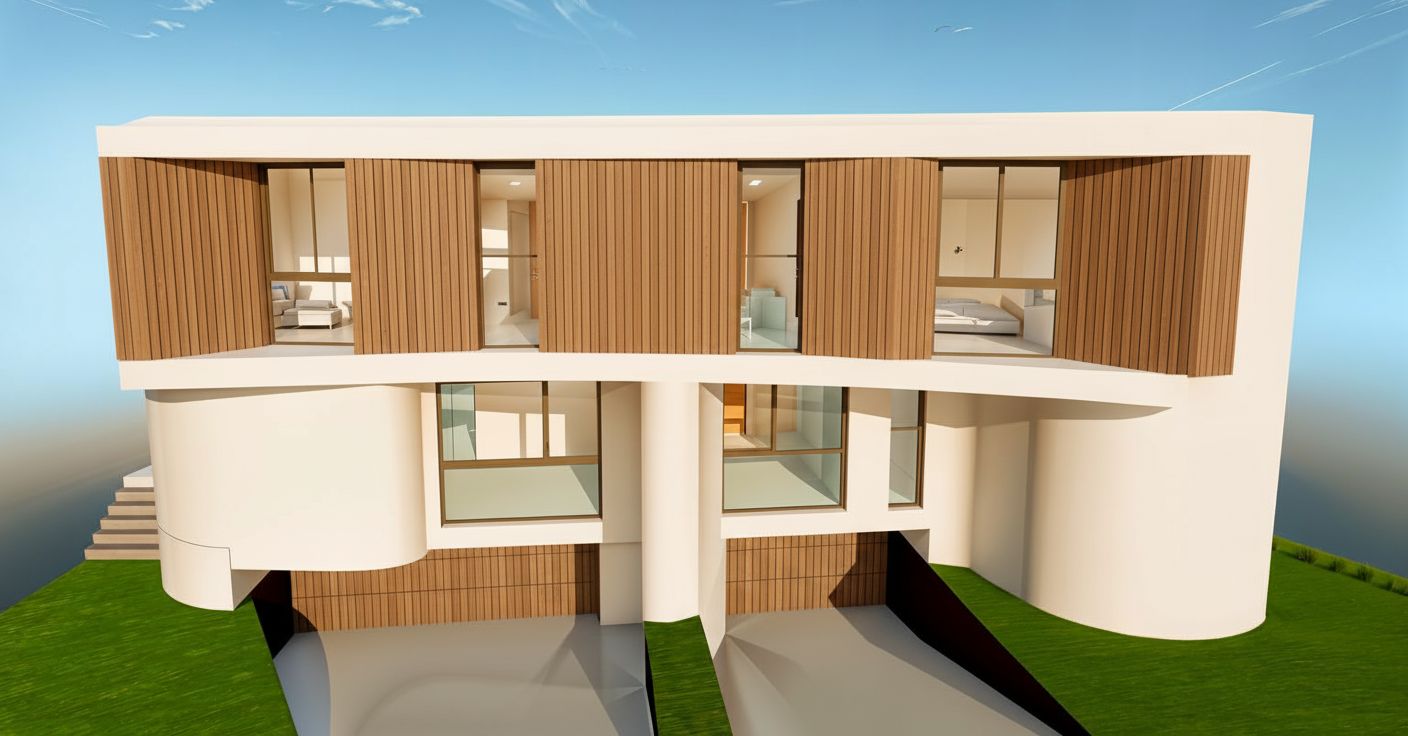 render a modern architectural structure with a sleek minimalist design the building features smooth curved white walls and vertical wooden paneling in a warm oak tone large clear glass windows reflect the daylight offering a glimpse into the neatly arranged interior the foreground is a vibrant green lawn and the background showcases a clear blue sky with a few delicate wispy clouds the atmosphere is peaceful and harmonious with a soft natural light enhancing the elegance of the architecture