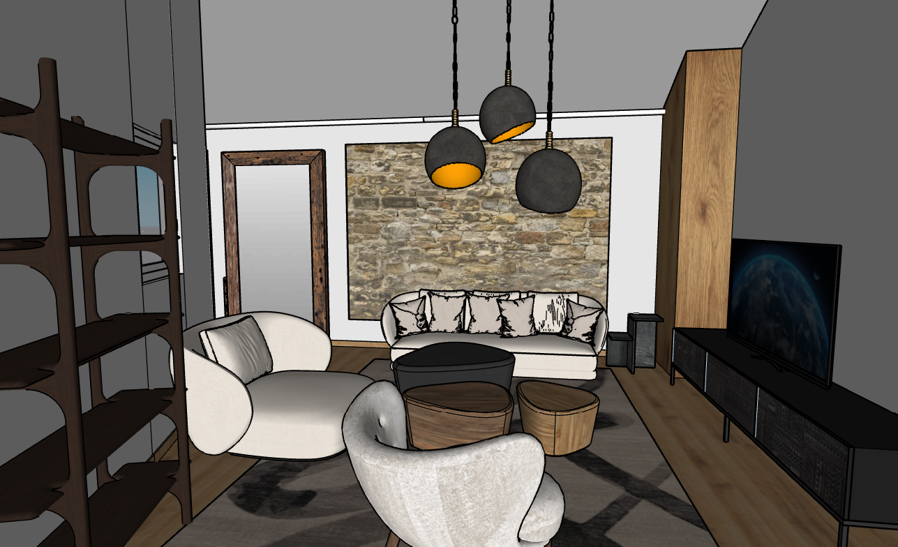 ilumina el contorno del muro de piedra con luz calida coloca una cortina clara en la ventana que vaya de piso a techo con un movimiento y caida natural el espejo de fondo tiene un marco de madera en nogal