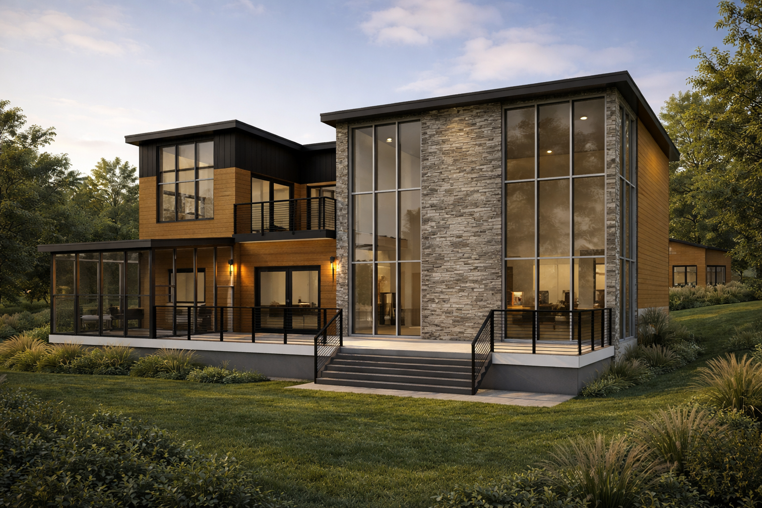 add tall oak trees and pine trees behind and on right side and add a pool on lower left with a few people on the deck make no changes to the house as rendered