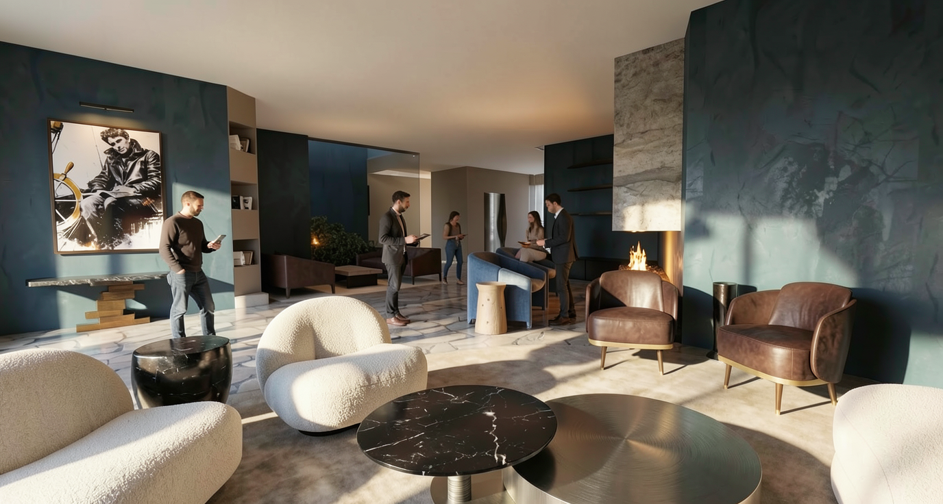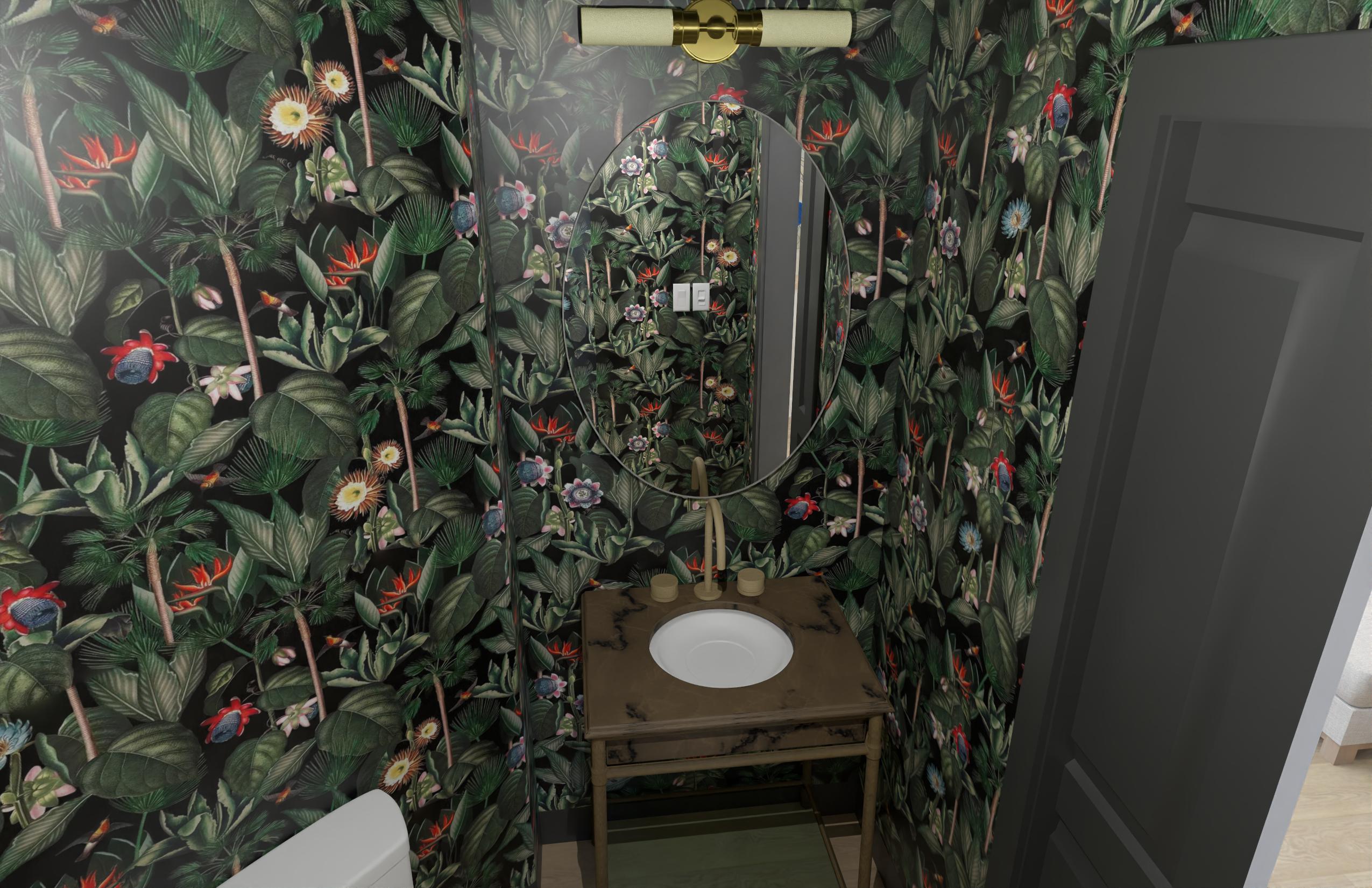 create a cozy vibrant small bathroom with lush tropical wallpaper featuring large green leaves and pops of red yellow and purple flowers add a rustic wooden vanity with a smooth white sink and gold accented faucet place an oval mirror above the sink reflecting the rich textures of the wallpaper subtly illuminate the space with a soft light ensure the atmosphere feels inviting and serene with a harmonious blend of natural and elegant elements keep the vanity counter stone the same material as the original scene but with calm white veining instead of black veining dim the light more