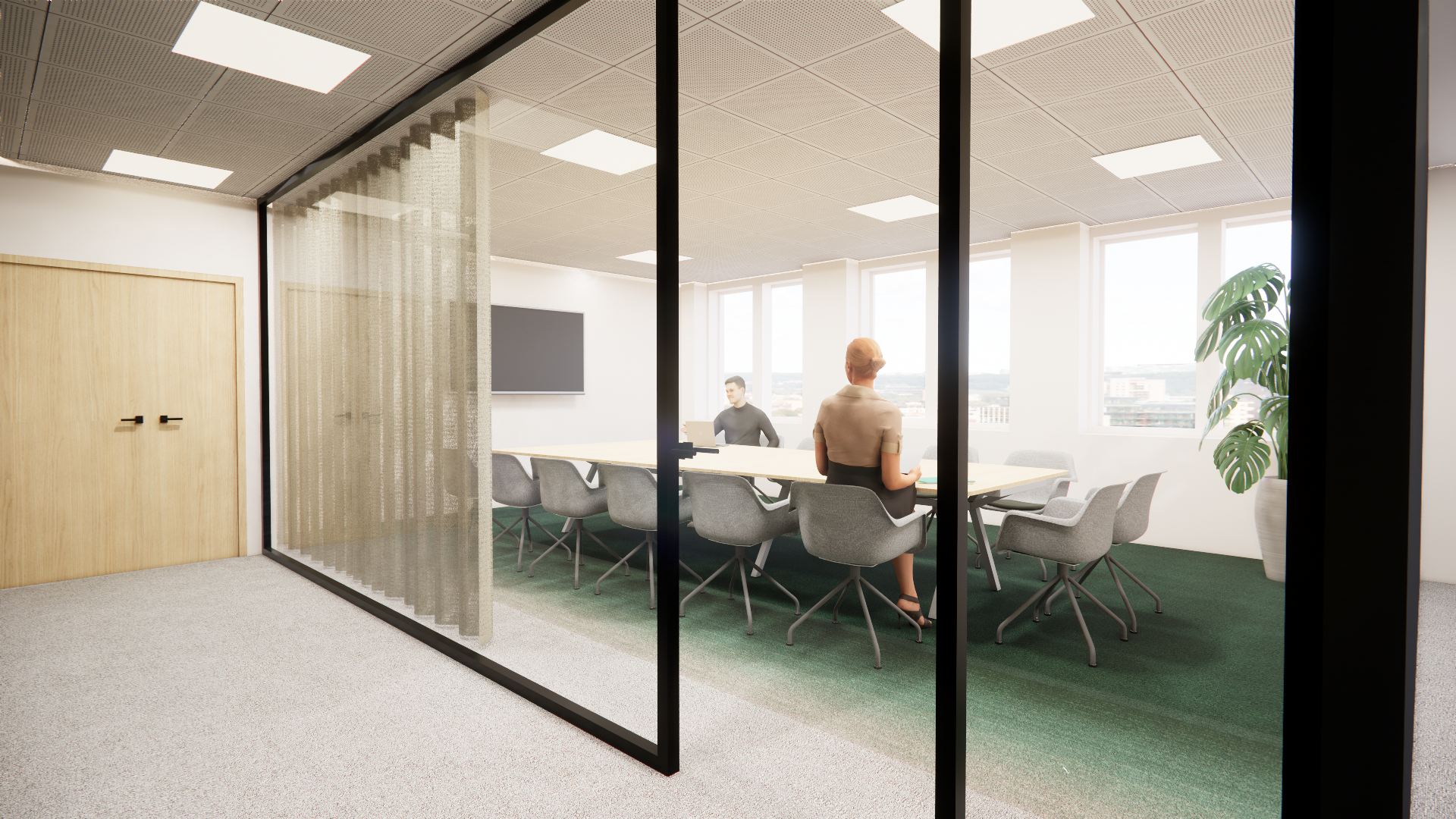 create a stunning 3d rendering of a modern office meeting room the layout features an large meeting rable with white walls creating a minimalist and sophisticated atmosphere use warm wooden accents for the table and the door and incorporate a green plant for a touch of nature contemporary lighting fixtures infuse natural light streaming in from large windows enhancing the bright and airy ambiance on the back wall a screen with teams meeting the room is filled with young dynamic workers