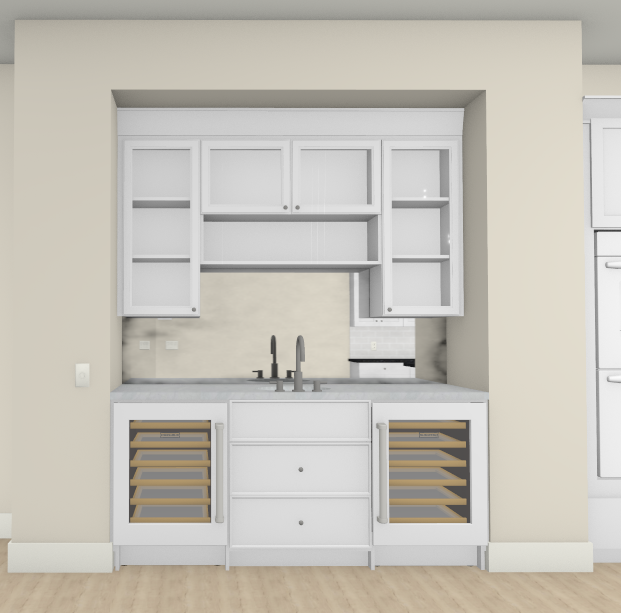 kitchen wet bar with 1 wine coller and a beverage cooler backsplash is a mirror