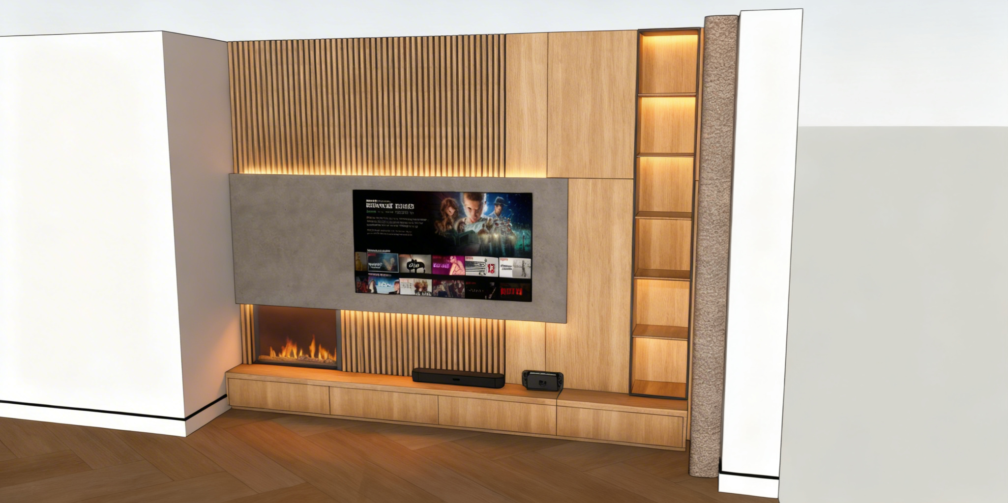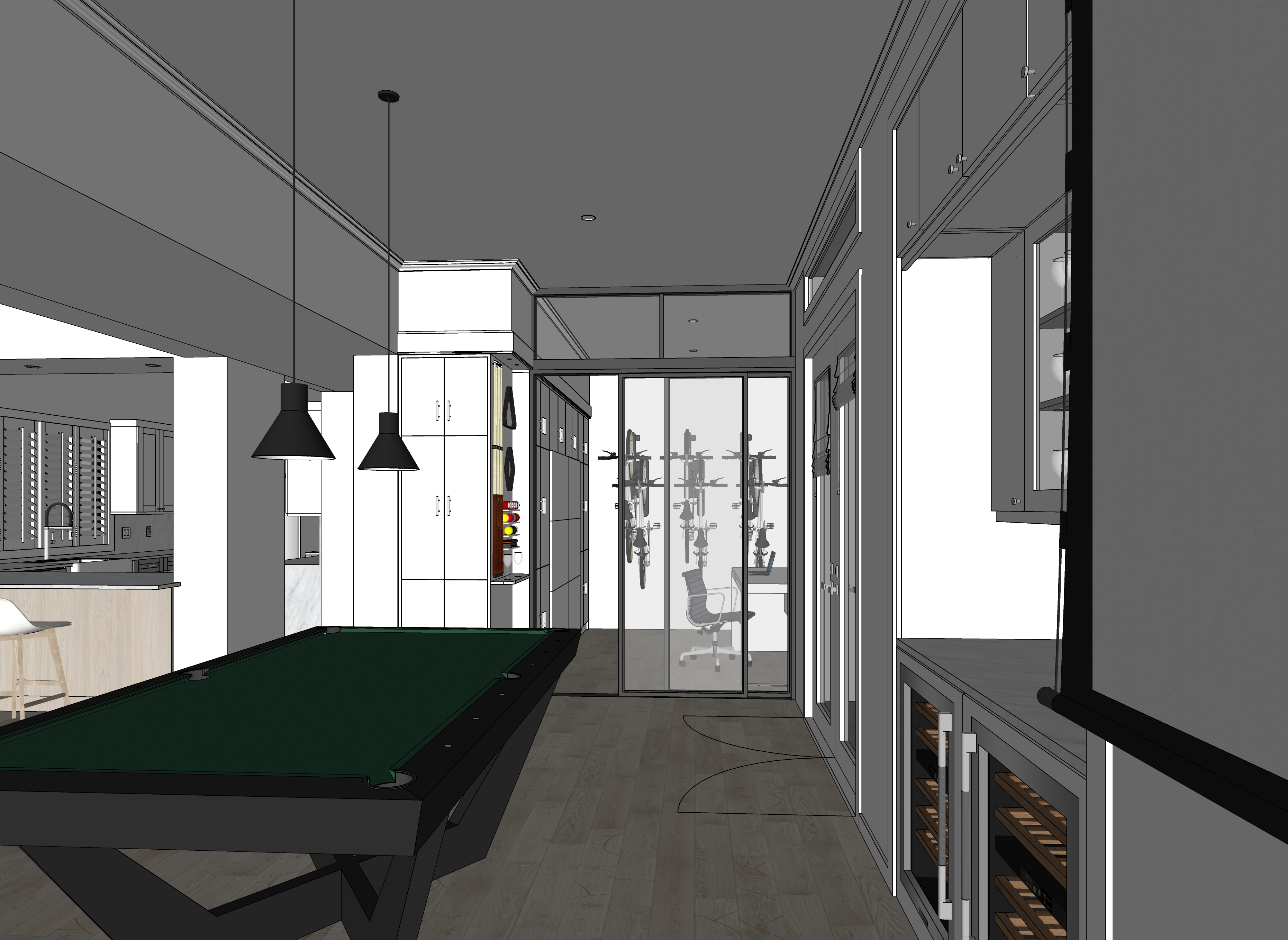 add lighting on the white marble countertops keep the cabinets white like the source image the walls are painted white show a music video from kendrick lamar on the screen at the right side of the view keep the light effect over the pool table add light effect where there are recessed lights add a man sitting at the desk working at the laptop do not add any recessed lights to the view all cabinets doors are slab design not shaker don t add any pendant lights over the desk make the light color temperature warmer keep the ceiling white and all of the walls painted white