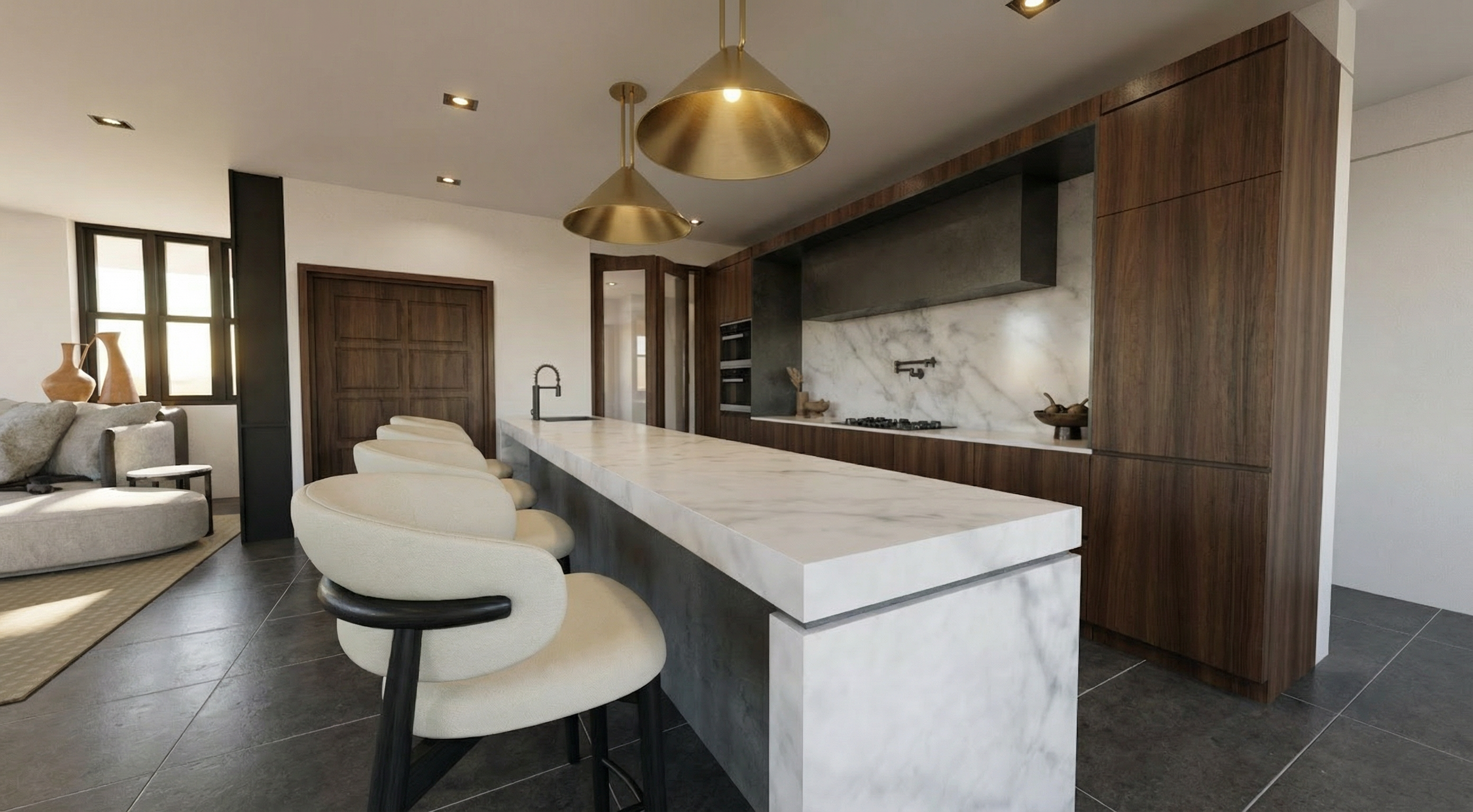 zoom out and add minimalist dark simple timber table the lamp should be suspended as a ceiling lamp in the middle of the space wabi sabi minimalist dark atmosphere