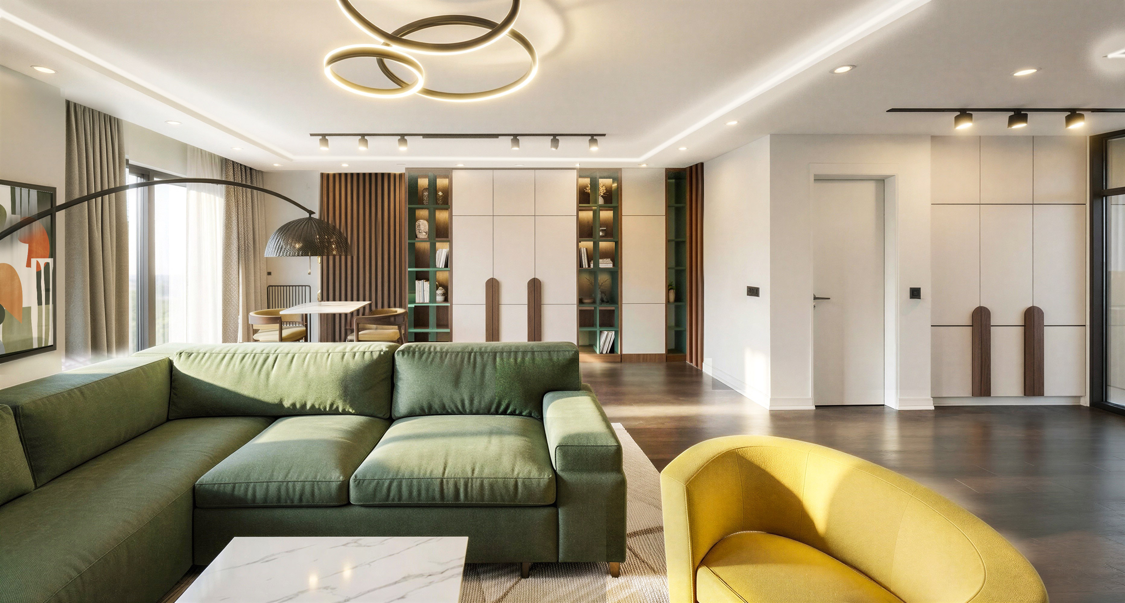 do not change the geometry and colors and materials make the curtain in tle left side with color yellow musterd