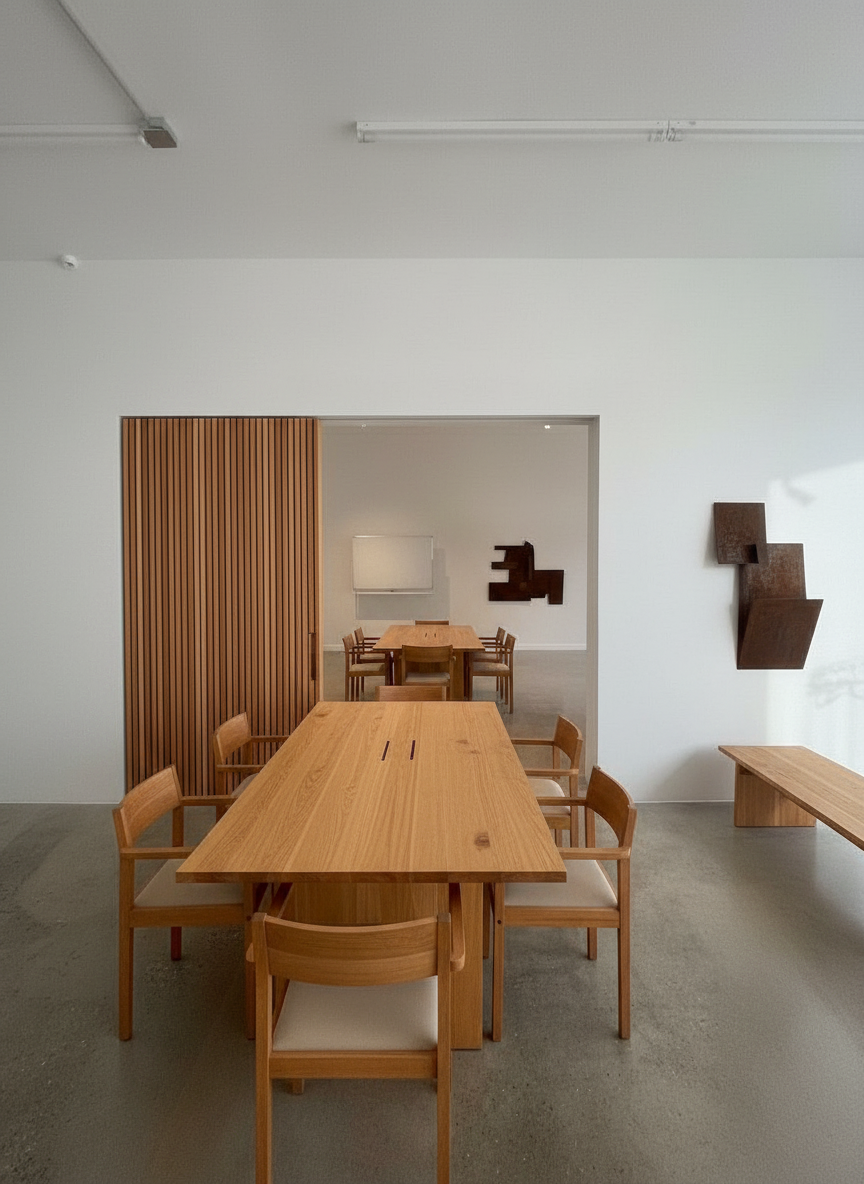 minimalist warm marfa digital production office warm wood with single leaf wood slider slab door to the left with conference room beyond nothing in front bare walls