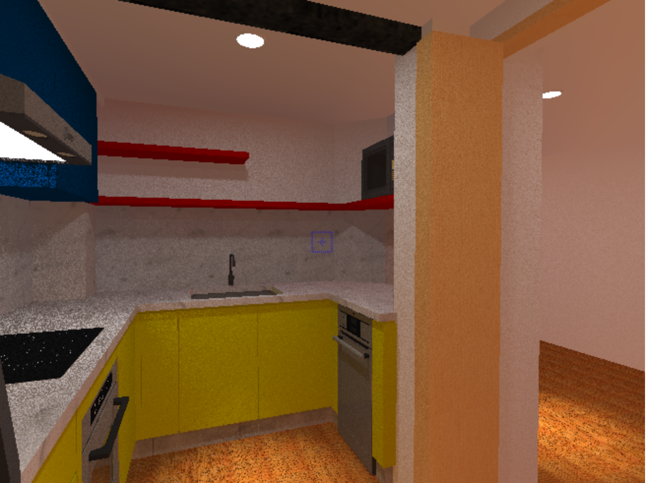 change the cabinet into a american walnut veneer with the countertop and backsplash in white corian the surface must appear seamless clean and subtly reflective wall cabinets in medium gray matte lacquer finished should be smooth non reflective include indirect lighting under cabinet led strips the lighting should create a soft ambient glow add in both sides of the wall cabinet a floating wood shelf into walnut veneer with under indirect led strips the appliances of the refrigerador must be represented in stainless steel with realistic reflections and finishes the cooktop is a 4 burner electric cooktop the lightning should be warm and balances the floor change into a laminate walnut veneer flooring and white plaster finish on walls and ceiling change the yellow material into american walnut veneer add the kitchen decorating like spice containers whit glass jars with wooden lids replacing a high arc stainless steel single handle kitchen faucet change the red material of the shelves into a american