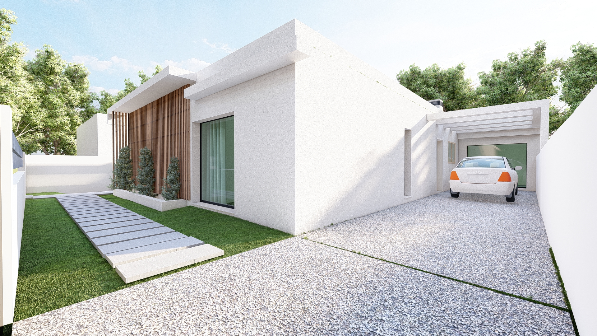 vista exterior com filtro de realismo com ilumina o natural do sol fachada podemos ver ripas de madeira e parede cor branca vegeta o e grandes janelas luz do sol reflete na janela