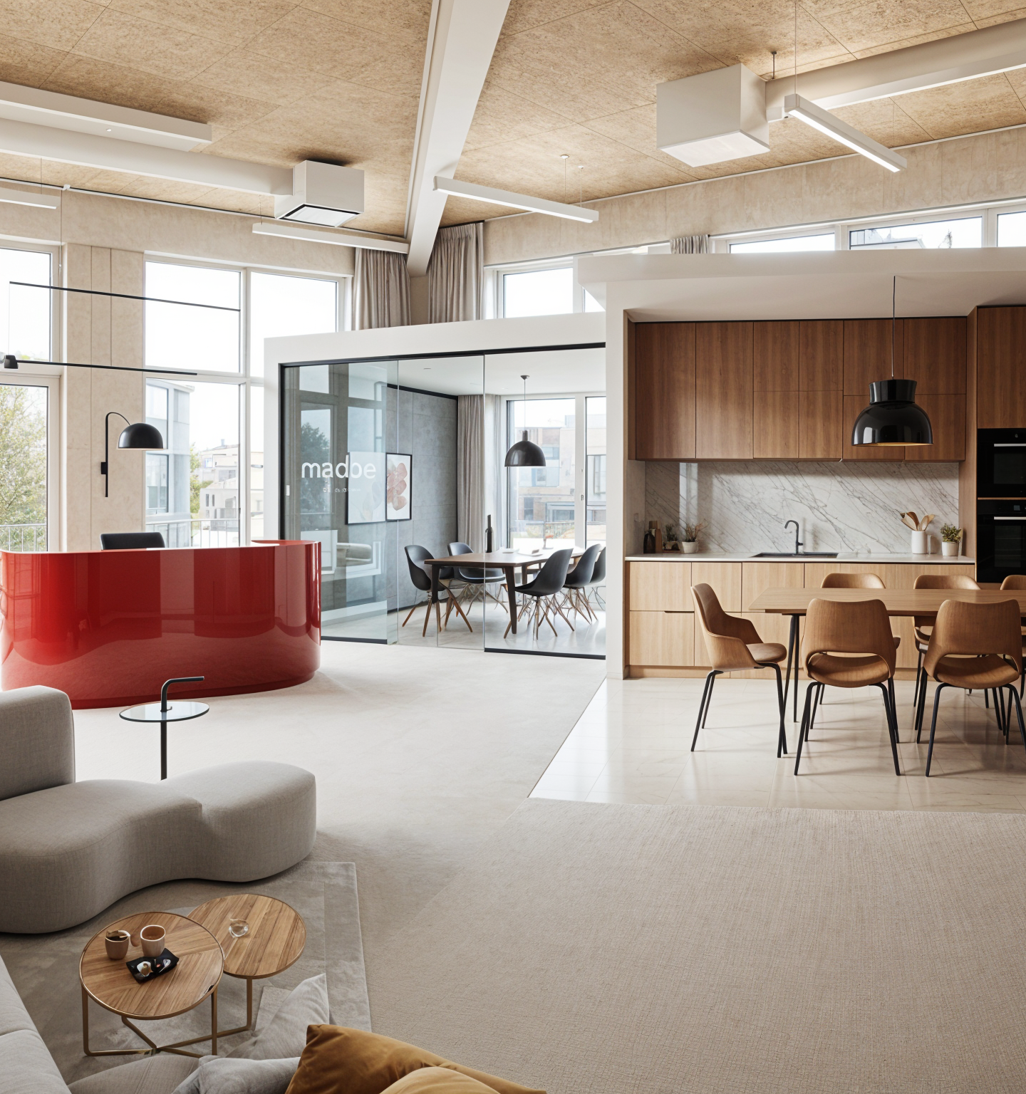 modernist interior shot this photo is a gallery inside my building i want you too change the color of the walls and roof to a color you think will look good the bottom gallery will be a sculpture gallery so add sculptures the floor where the photo is taken on will be a painting gallery so add paintings add a glass railing around the circle along with a spiral staircase coming through add people the floor to height is 12 ft to size people good make it seem very realistic architecture