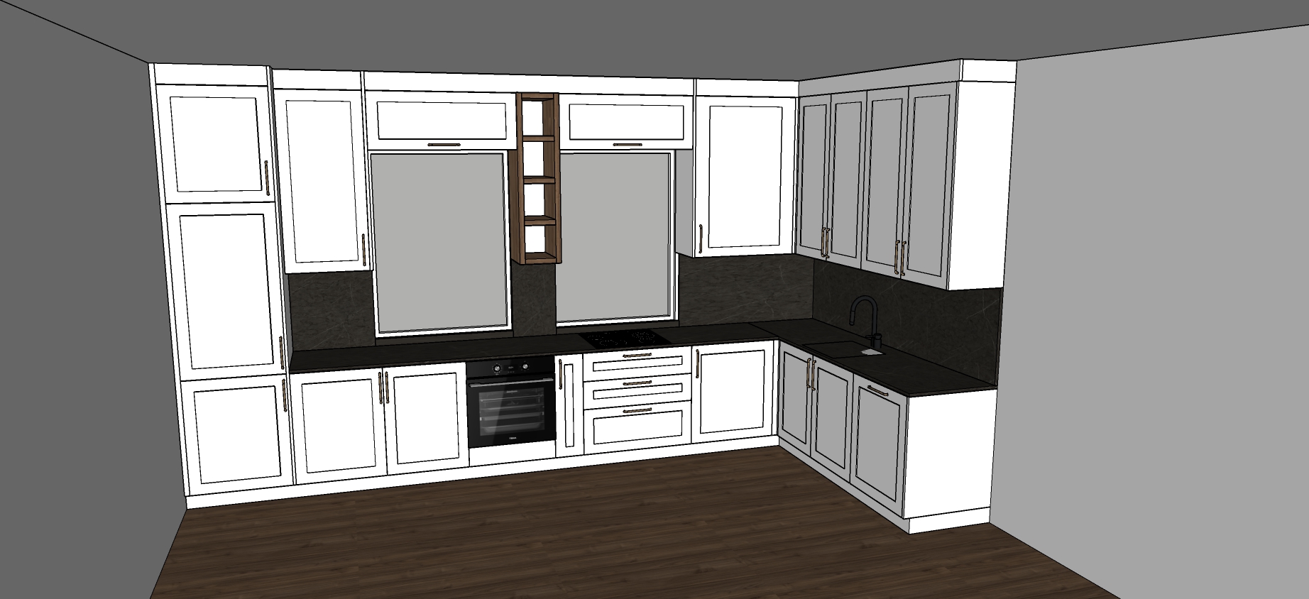 the cabinet fronts are white super matte and marble is matte too 2 remove the led on the floor of kitchen and keep everything else the same