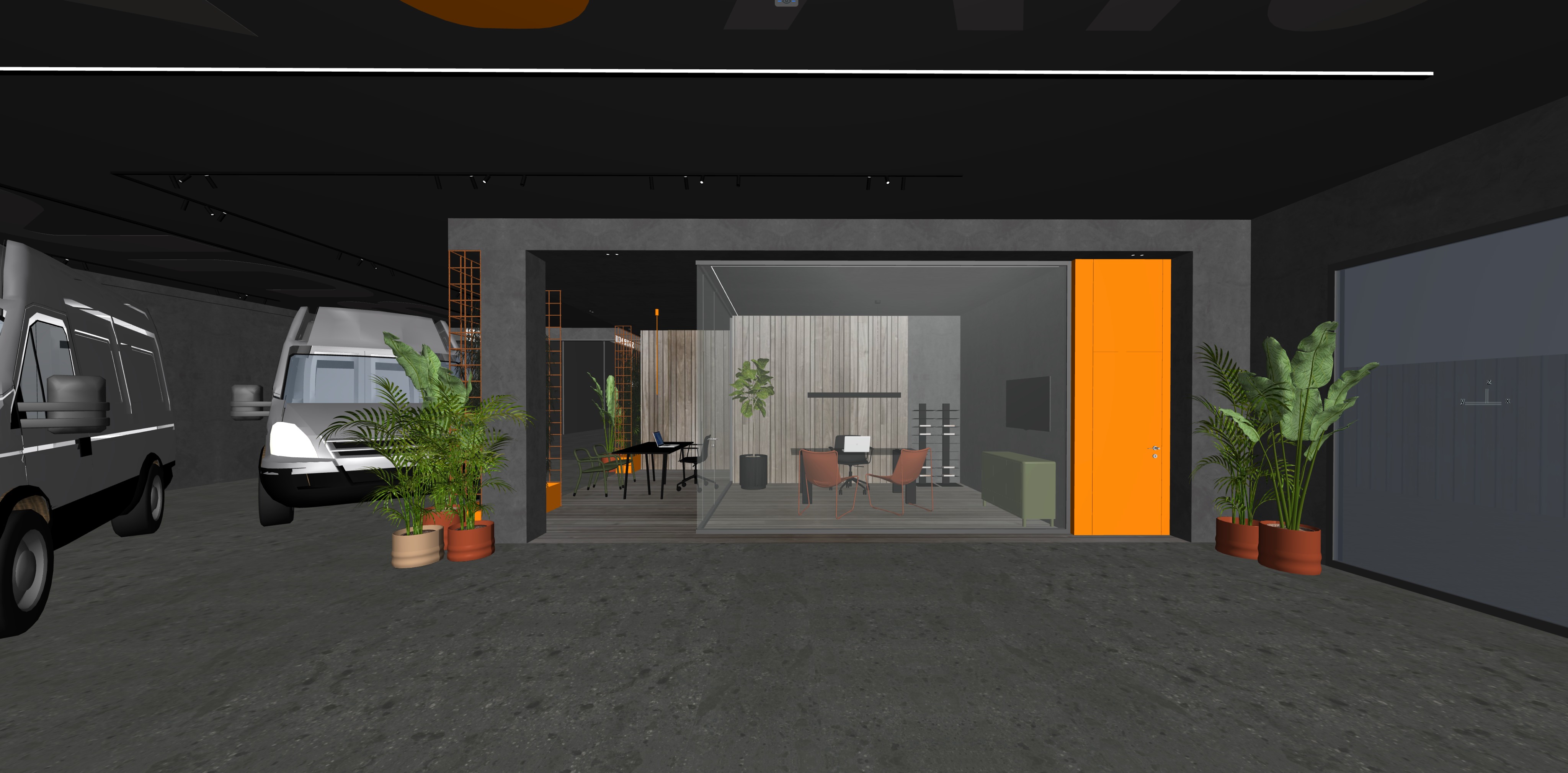 illumina la scena in modo diurno fai entrare luce naturale dall infisso a destra e anche da davanti mantieni texture e oggetti invariati legno a terra nella parte degli uffici stesse doghe della boiserie mantieni il resto del pavimento e del soffitto grigio scuro accendi luci strip led verticale alla fine della boiserie in legno che spara verso l angolo del muro grigio accendi tv accendi faretti binario a soffitto accendi barra led a soffitto orientata verso la scritta a soffitto la deve illuminare radente sostituisci van della scena con van pi belli grigio metallizzato prosegui muro grigio scuro anche dietro i van soffitto ufficio grigio scuro