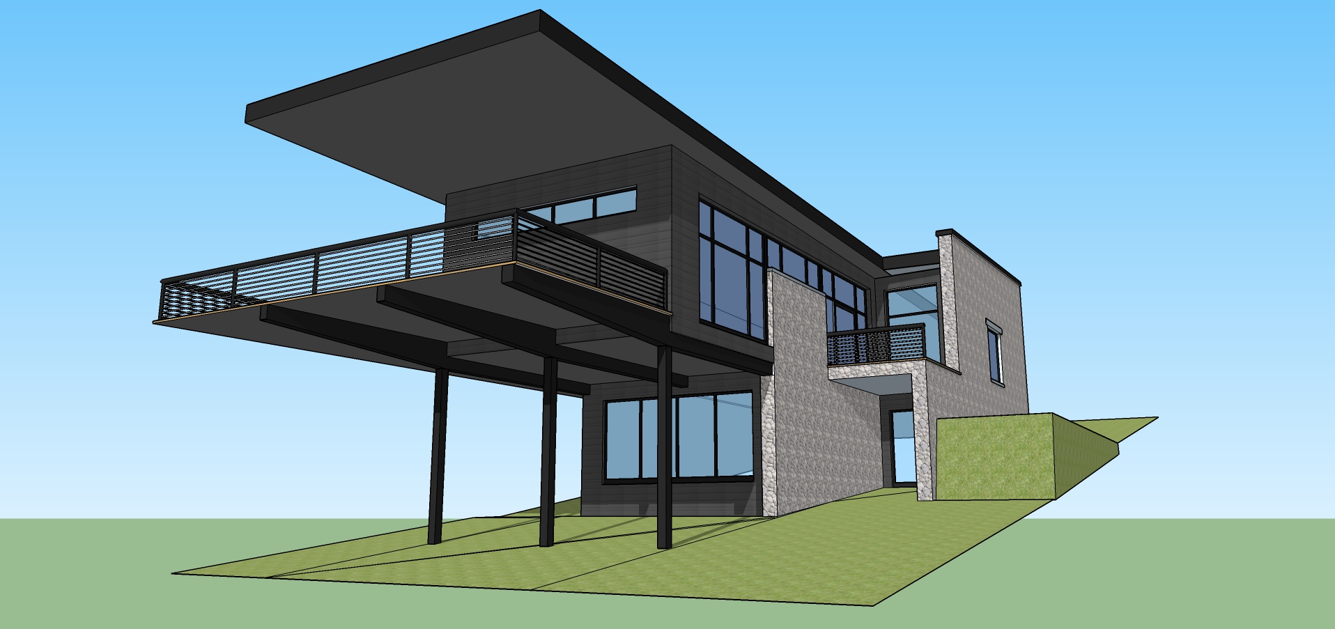 render a clear sunny day scene with the glass transparent and see inside of the house all steel shall be black and all stone shall be a light grey color add a lot of vegetation and make it look like its sit on top of a mountain