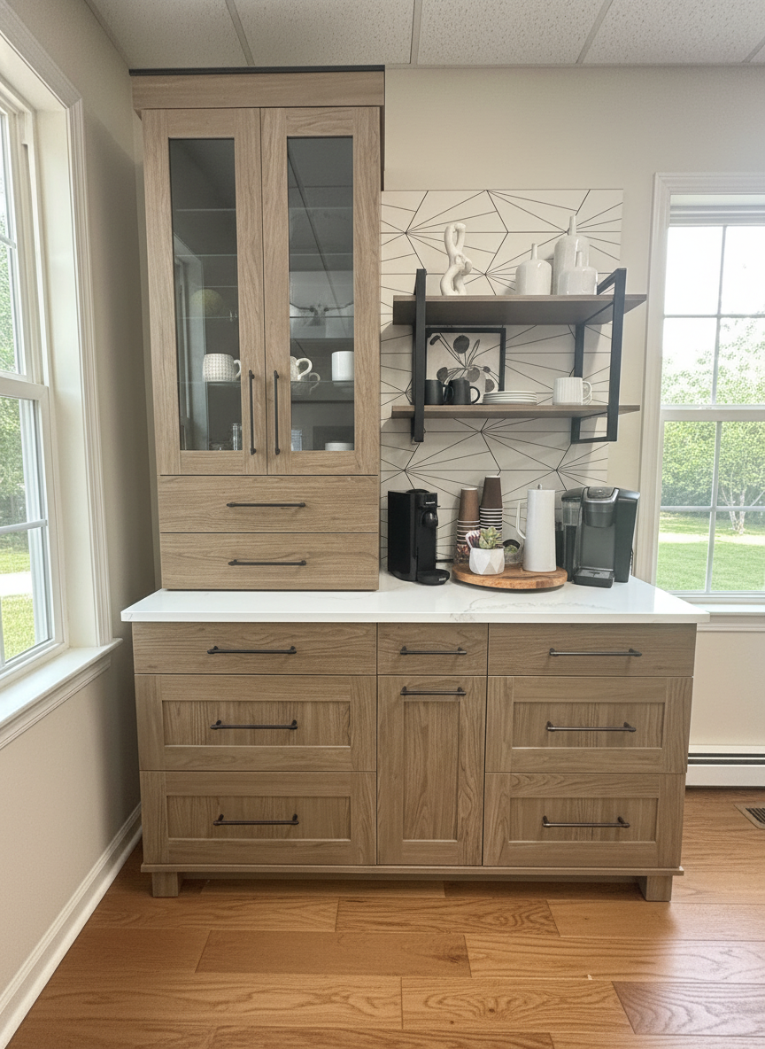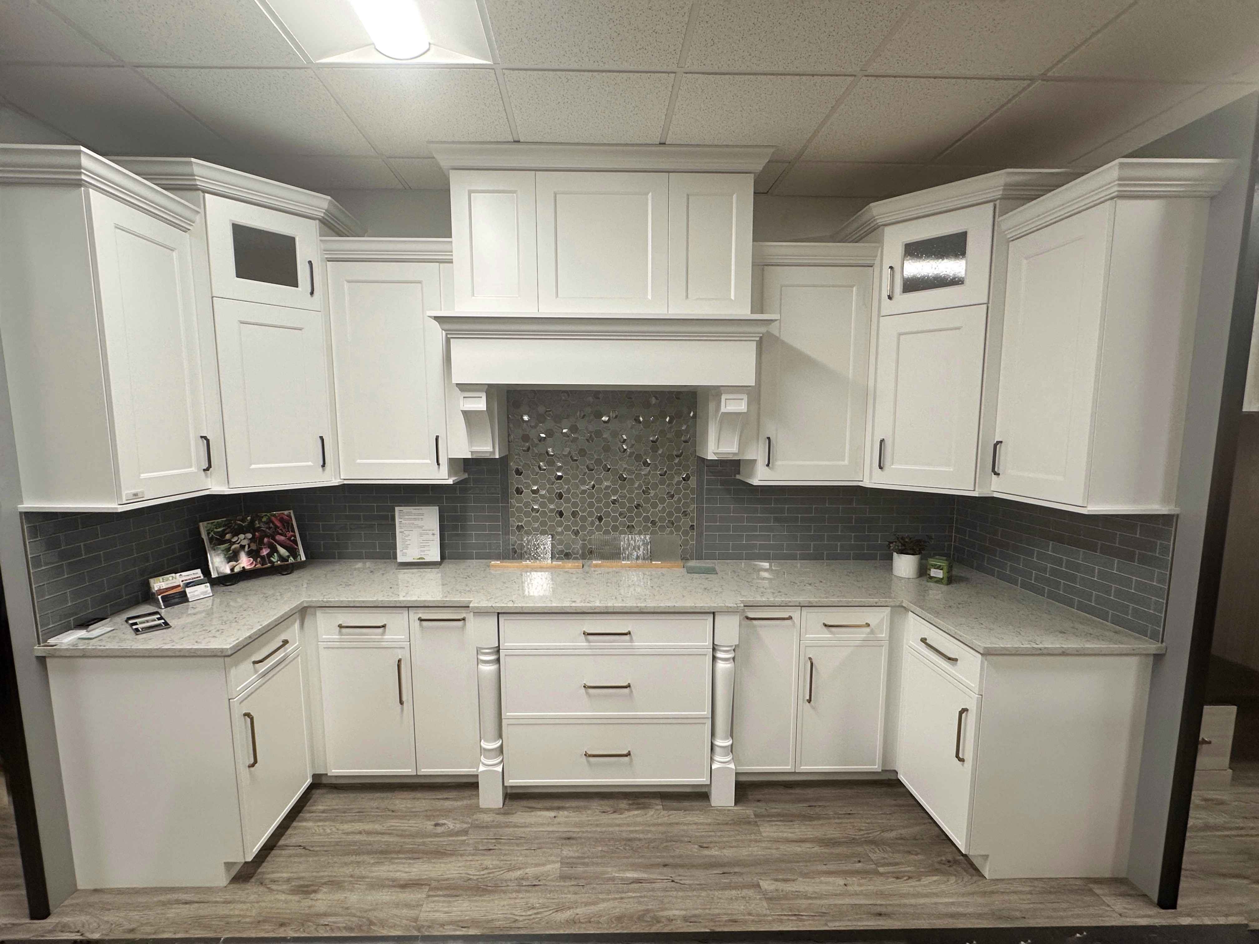 put these white cabinets in a residential home with new floor drywall ceiling natural light put in a new backsplash add a cooktop below the hood and restage the countertops do not add or change the cabinet layout