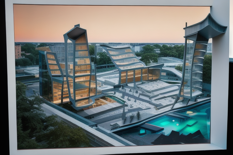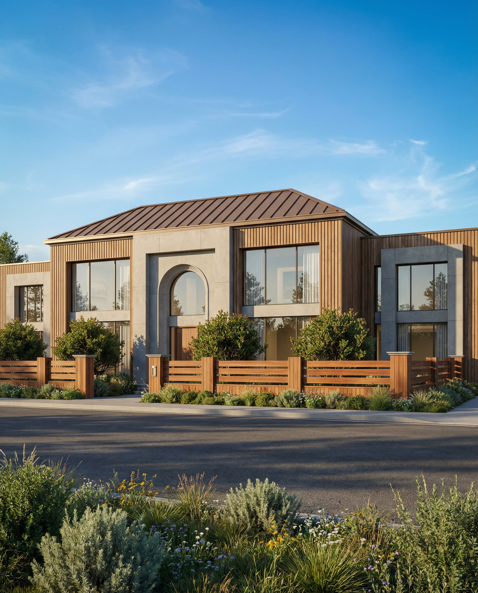 a modern two story house with a sleek design featuring a light gray facade and wooden accents large floor to ceiling windows reflect the clear blue sky enhancing the contemporary aesthetic the roof is a subtle earth toned brown in the foreground a neatly arranged wooden fence surrounds lush greenery and perfectly manicured shrubs the garden is adorned with vibrant green foliage and dotted with delicate white and yellow flowers the scene is set in the gentle warm light of a late afternoon creating a serene and inviting atmosphere architecture