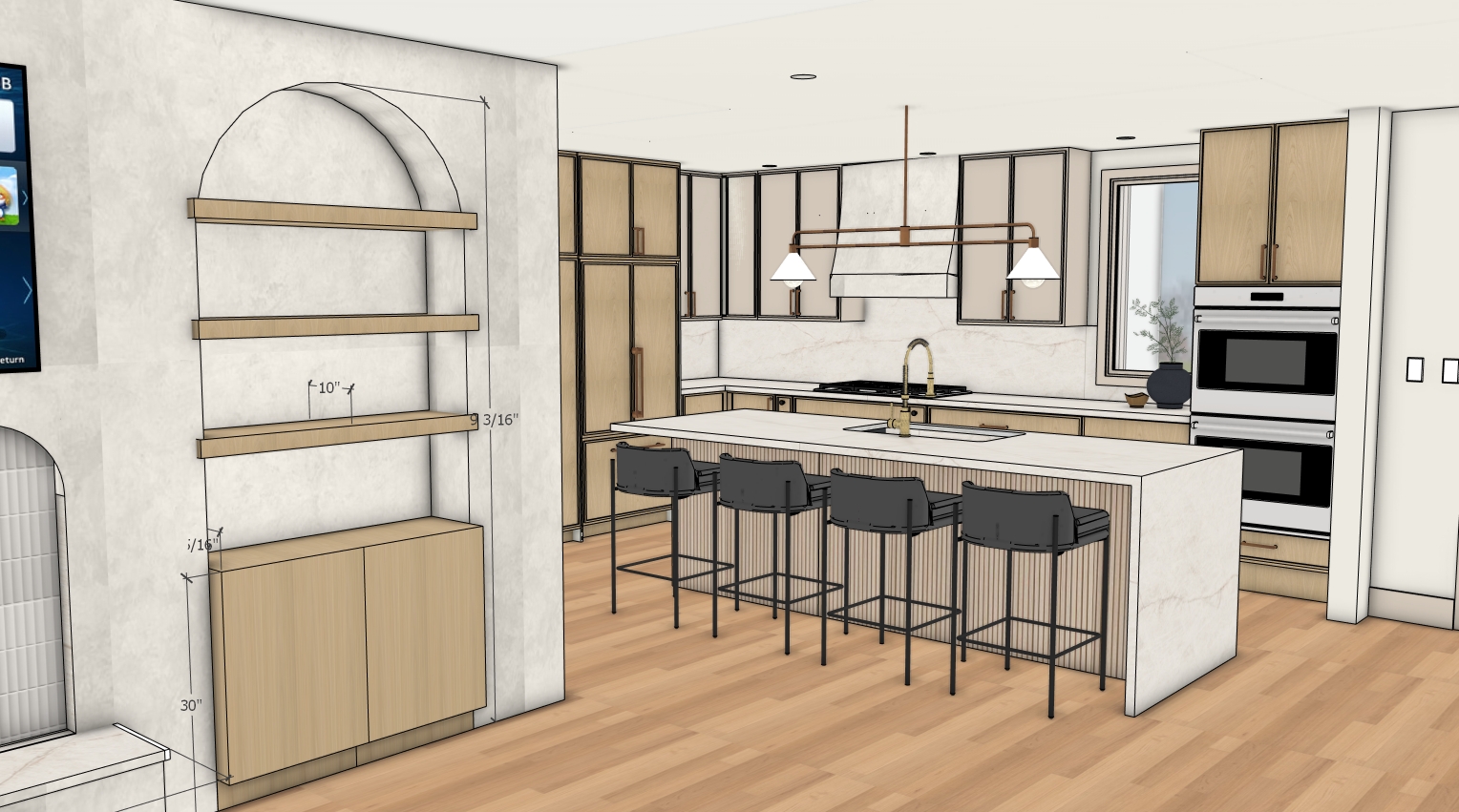 edit this 3d view to keep materials but use photorealistic lighting venitian plaster on the range hood and wall taj mahal on the countertops and backsplash and put a little bit of general ambiance lighting in with sunlight