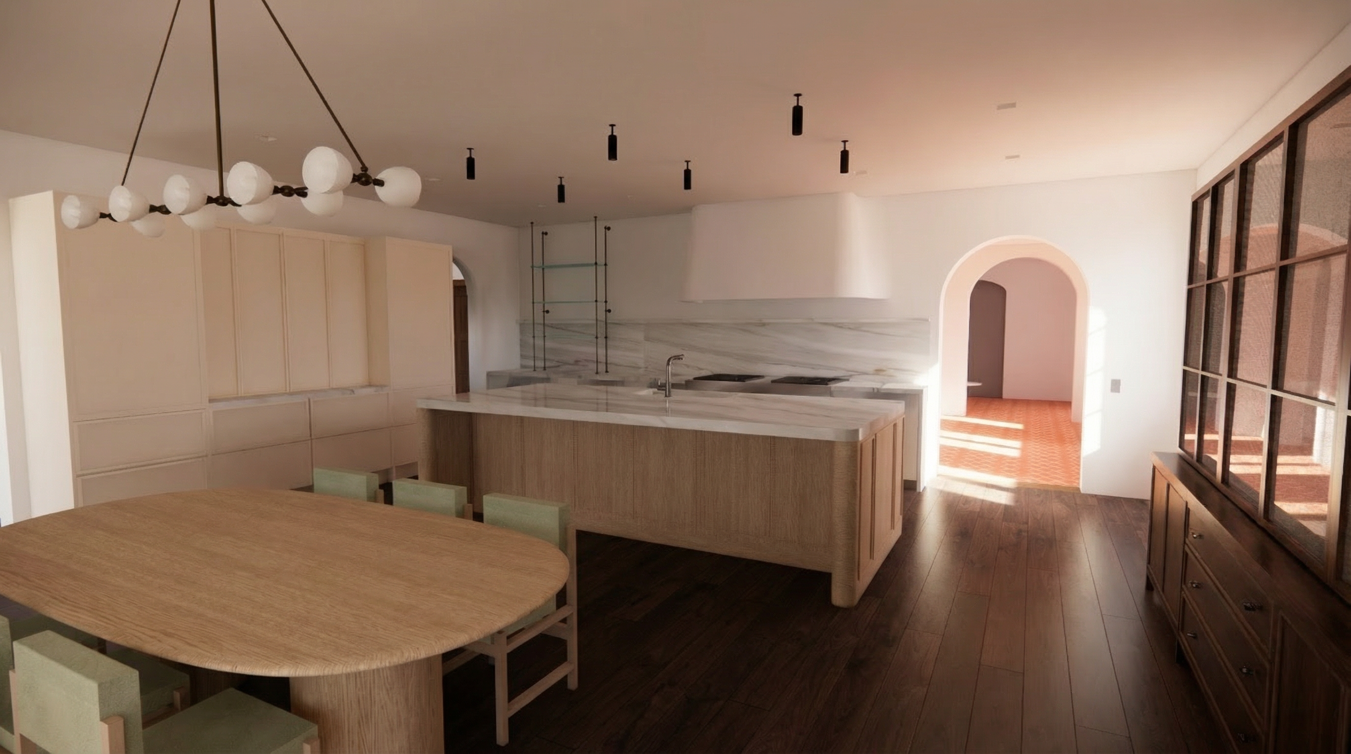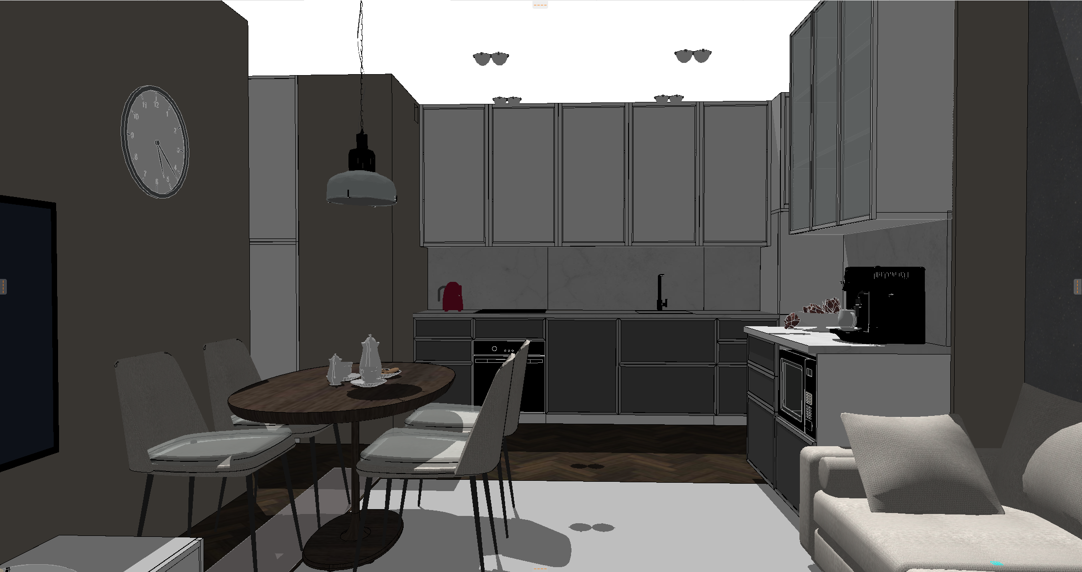 transform this image into a realistic high end interior photograph of a kitchen living room in a romantic parisian apartment style preserve the original architecture room proportions and furniture scale exactly do not modify walls openings ceiling heights furniture size or layout soft elegant color palette gentle contrasts refined moldings delicate wall panels natural wood stone or marble accents and subtle brass details the atmosphere should feel warm intimate and poetic with a sense of effortless parisian charm natural daylight soft diffused light tender shadows and a premium editorial interior photography look