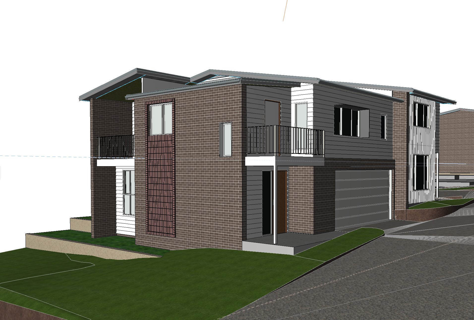 transform this archicad image into a high resolution render include landscaping a car and trees in the background