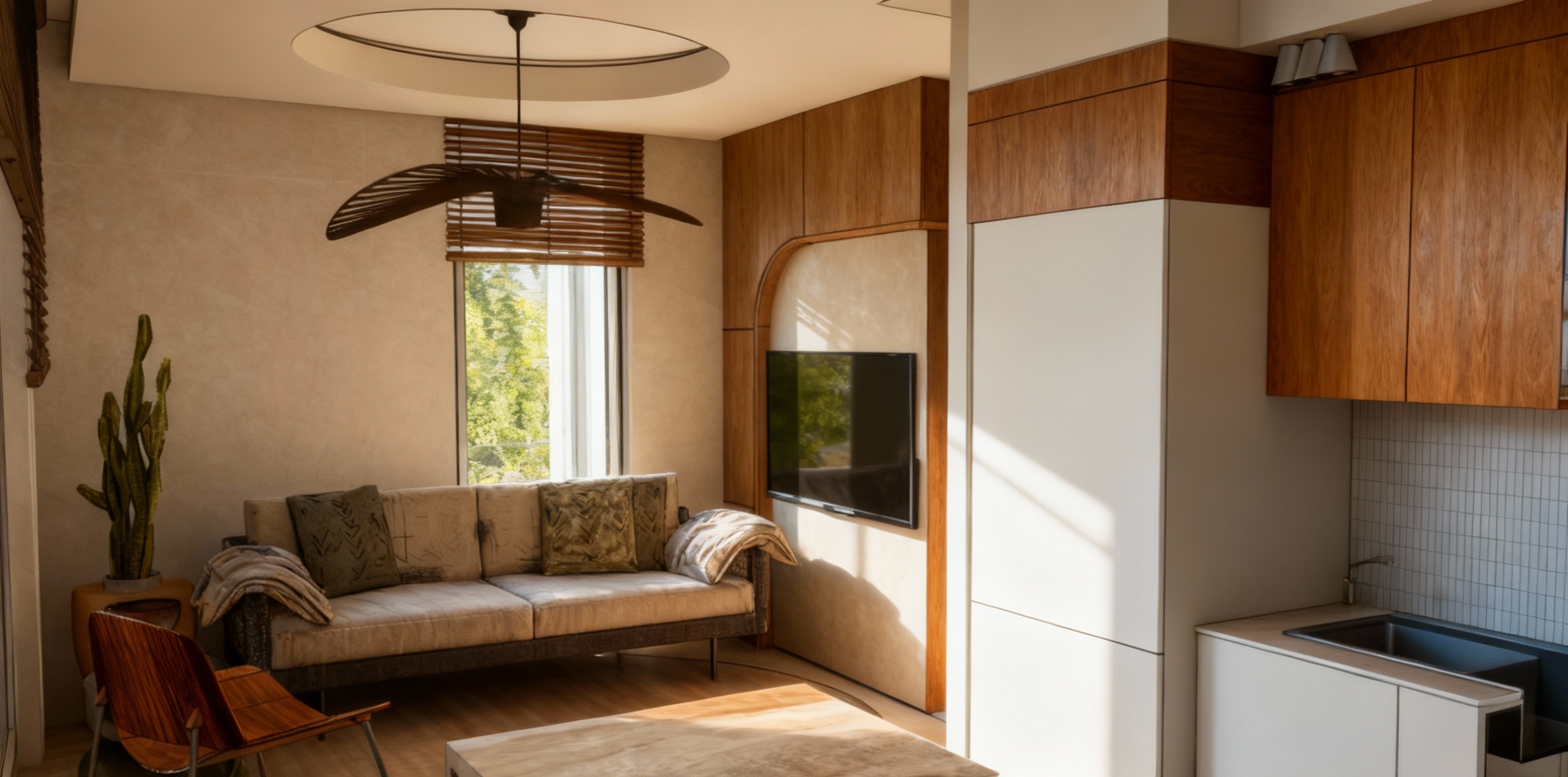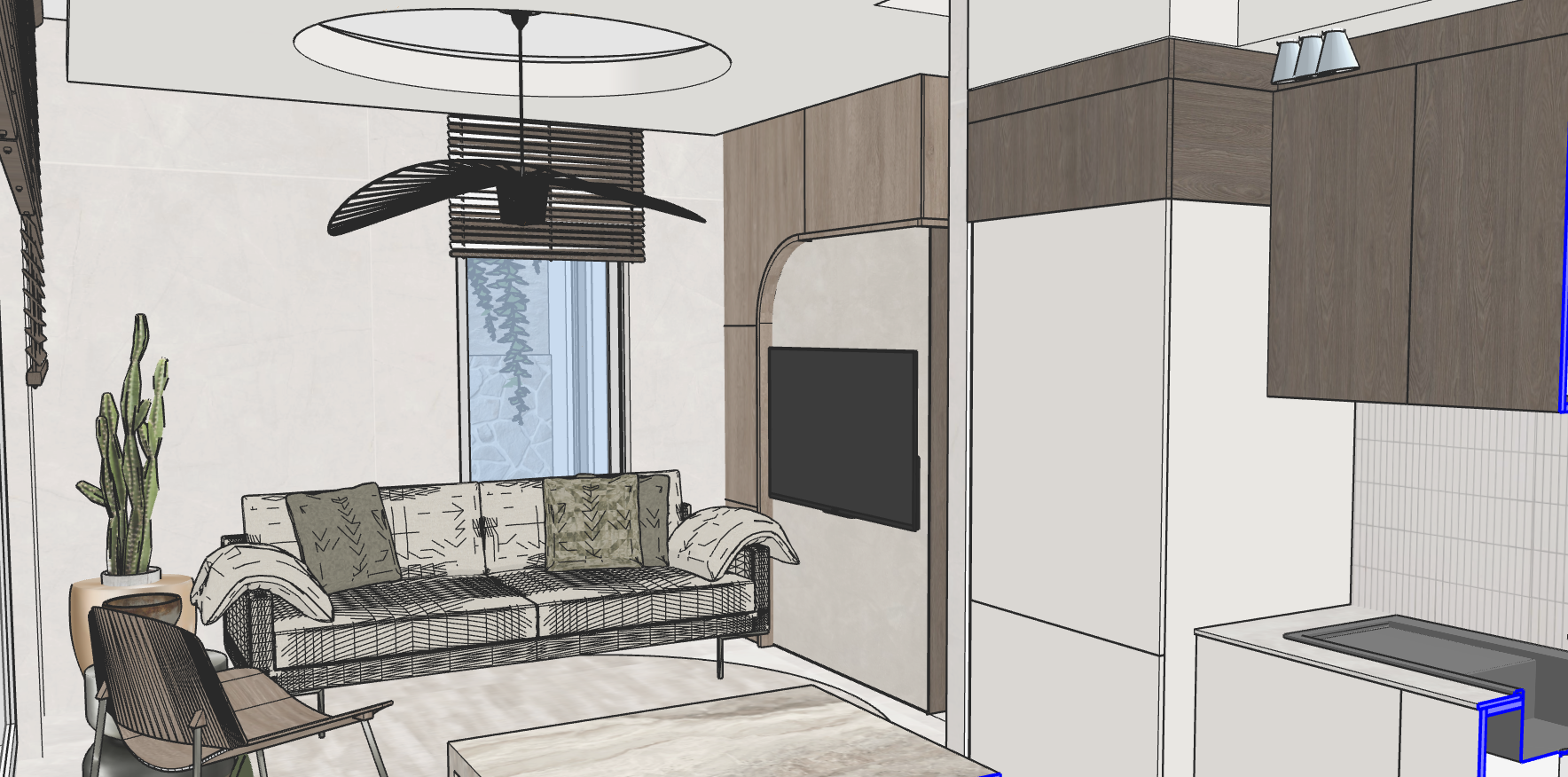 eliminate all sketch like or illustrative effects and generate a fully photo realistic render do not add modify or replace any objects materials or design elements use only the existing geometry and materials enhance the kitchen cabinets so they look like real cabinets with defined surfaces realistic reflections and proper material detailing instead of blocky masses turn on all existing spotlights and led strip lights ensuring accurate illumination and clean light falloff improve overall sharpness material realism lighting accuracy shadows and depth so the final result appears like an actual high resolution photograph
