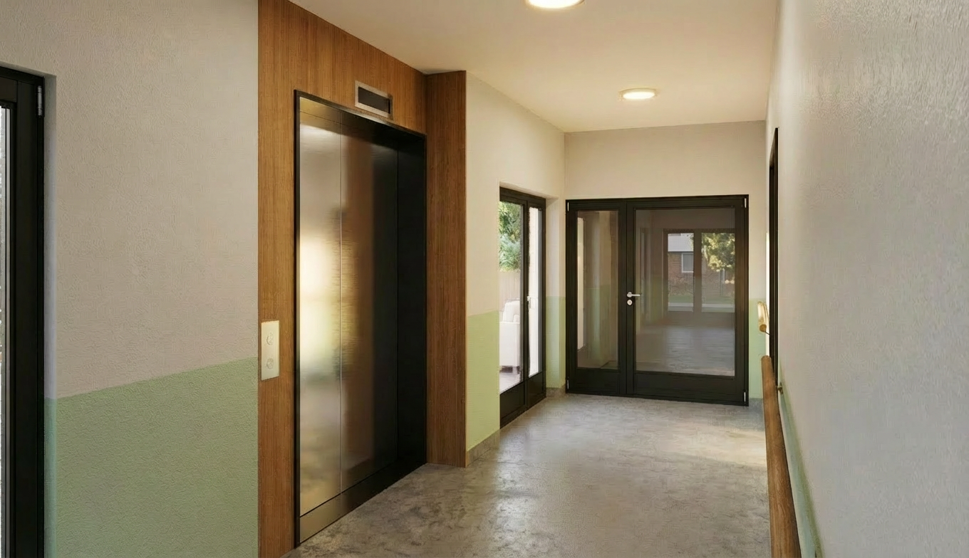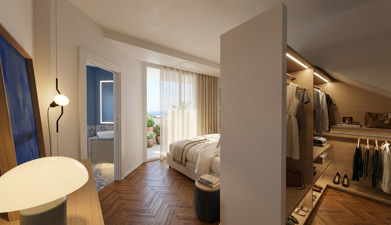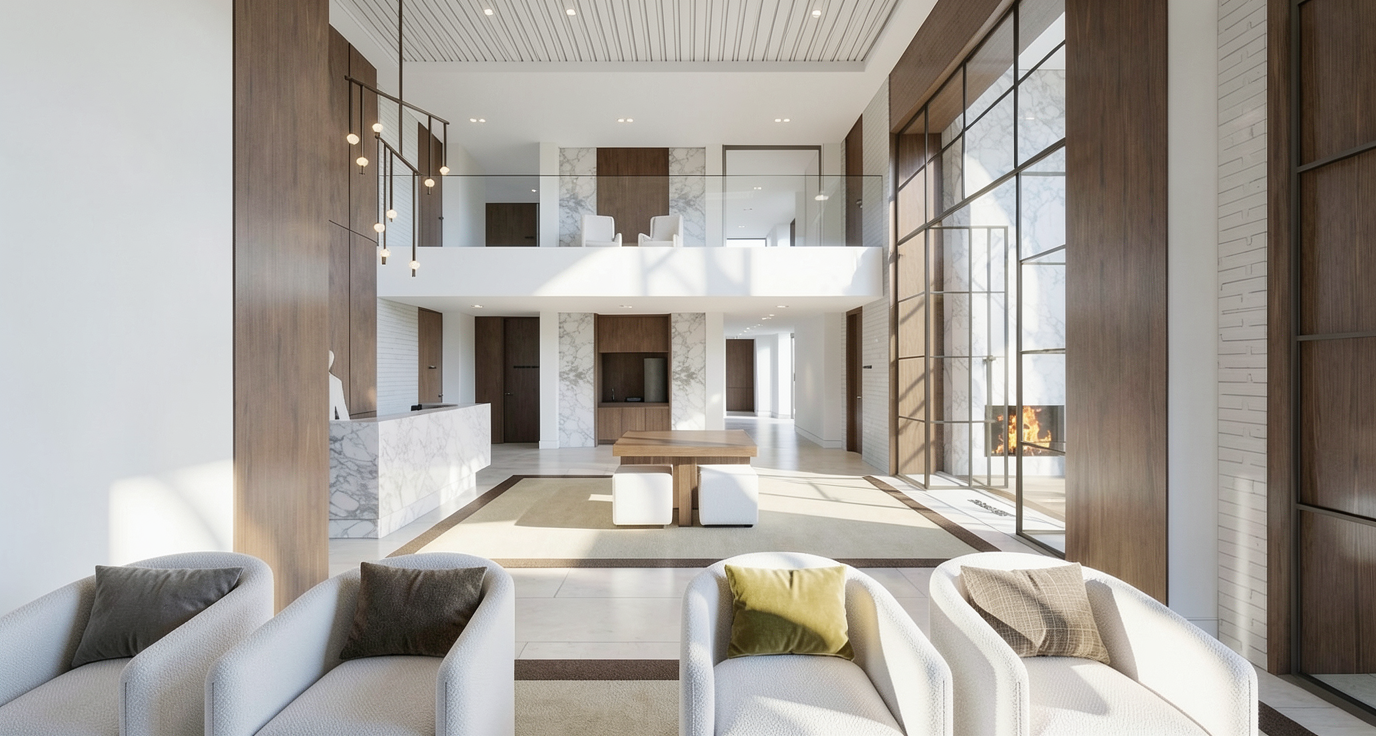 create a visualization of the space with a view from the kitchen towards the living room from an isometric background image view from inside the interior