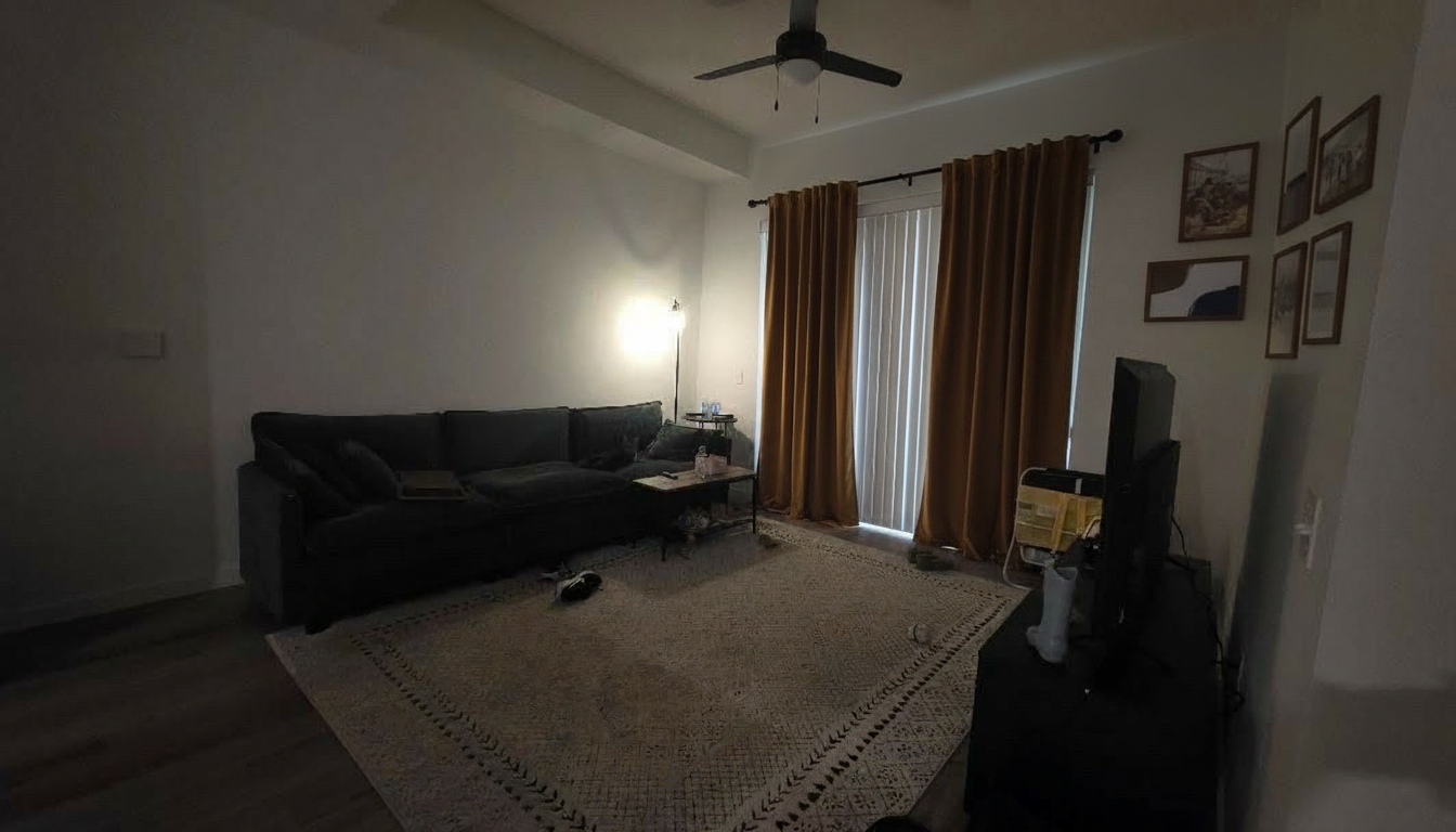 create a render in hyper realistic architectural visualization quality 8k resolution all objects furniture sanitary ware and architectural features must remain in place do not add any objects or delete anything from the image the spatial configuration must remain unchanged warmth gentle reflections soft shadows enhanced color richness and luxurious level realism improve depth and realism through wood grain richness brass highlights fabric texture and polished clarity while keeping the entire scene exactly as originally designed use downward facing light from the spherical wall lamp next to the round wall mirror use general daylight lighting in the room use a smooth white wall surface above the tiles the wall covering should be the same light color as the floor covering