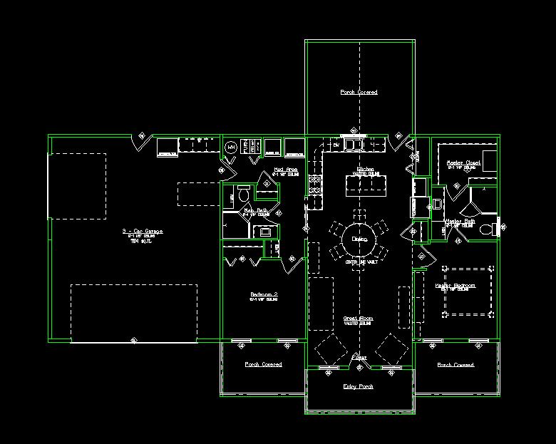 convert this floor plan into a realistic isometric 3d view of a full house show the space from an elevated angle with furniture walls and details visible garage has 2 car wide garage door in front 1 car wide on left side no rooms in garage cabinet and tv above rear wall right of rear door in corner rear wall in kitchen sink with dishwasher left door to covered porch right of sink large window above sink all the covered porches are concrete floor with no railing use the same furniture as shows on the plan do not change the orientation of the floorplan