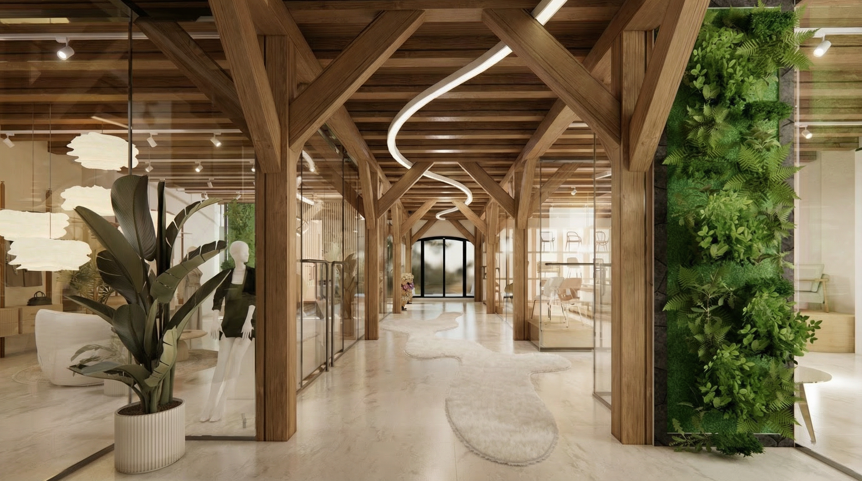 photorealistic interior visualization of a youth lounge called s base by sparkasse built inside an unfinished shopping mall raw concrete space the camera perspective is eye level facing four white pillars arranged in a square the designed room exists within this pillar square transform the raw construction area into a high end modern cozy youth meeting space for young adults aged 18 30 maintain realistic architectural integration into the existing shell structure design style premium modern lounge warm inviting stylish but financial brand appropriate use a balanced mix of wood soft textiles matte black metal and subtle concrete elements ambient indirect lighting led accents and warm light temperature brand integration subtle sparkasse identity elements red accents discreet logo placement but not overpowering the name s base should appear as a modern neon or backlit wall sign interior elements surfboards mounted high on the left and right upper walls as lifestyle d cor a dartboard located in the back right corner one to two standing tables in the front area a gaming zone with a large tv where people can play video games atmosphere lively but relaxed the space is populated with young adults socializing gaming talking and hanging out natural poses casual clothing authentic interaction flooring high quality vinyl polished concrete or wood flooring ceiling modern industrial open ceiling with integrated lighting ensure realistic shadows reflections and materials ultra photorealistic rendering 4k quality cinematic lighting depth of field professional architectural visualization optional add ons falls dein tool das unterst tzt du kannst den prompt noch erweitern mit camera render wide angle lens 24mm soft depth of field architectural photography style lighting mood golden hour lighting warm ambient evening light cozy lounge atmosphere quality tags ultra detailed octane render ray tracing global illumination