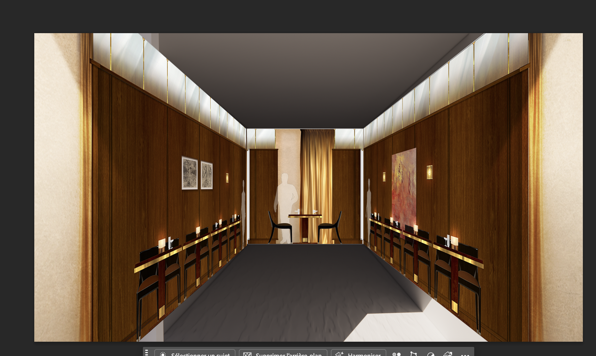 make this image into a 3d image the tables are in the middle of the space