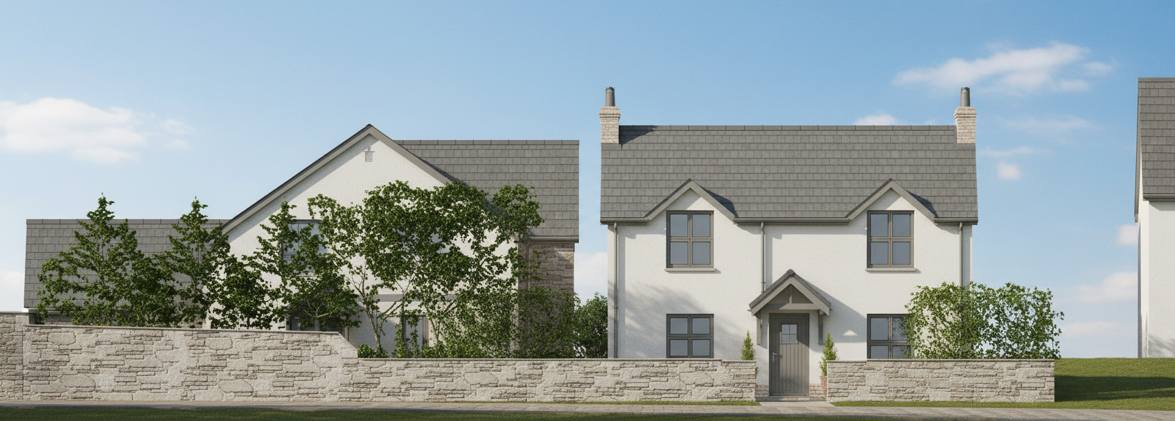 daylight white walls low stone wall forefront of building grey eaves on building no gap in forefront wall chimney stack red brick forefront wall in brown stone