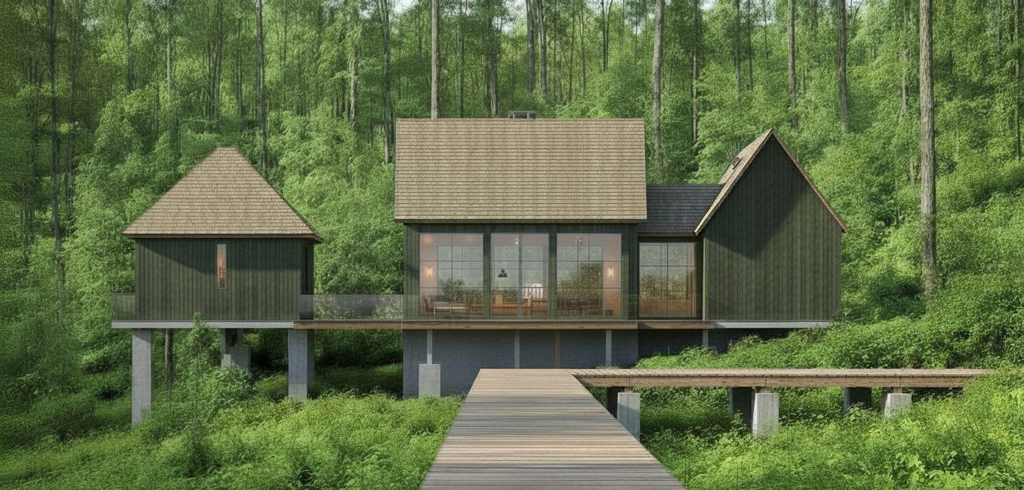 place this home on the top of a slope but preserve surrounding forest style materisals and colors