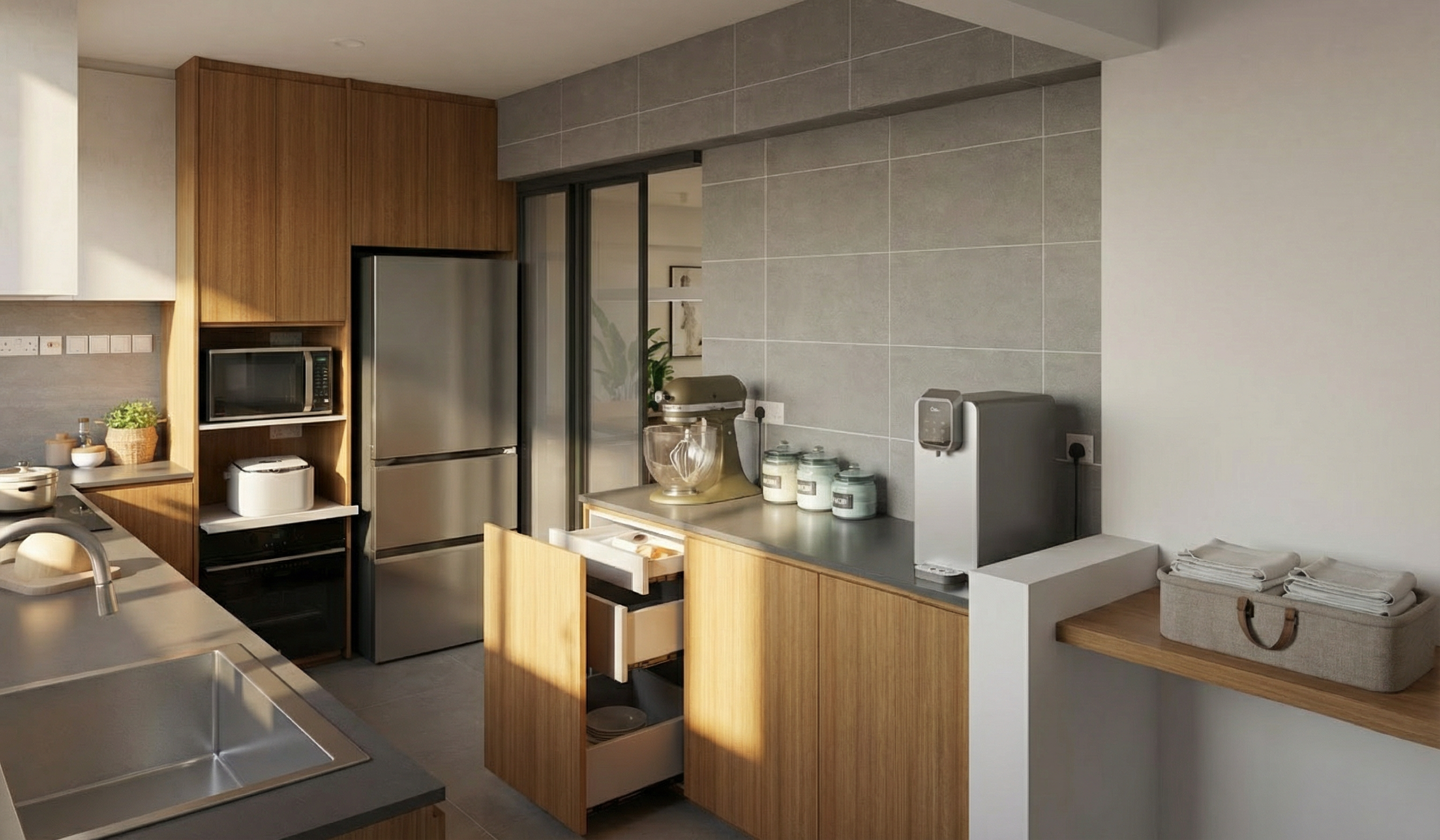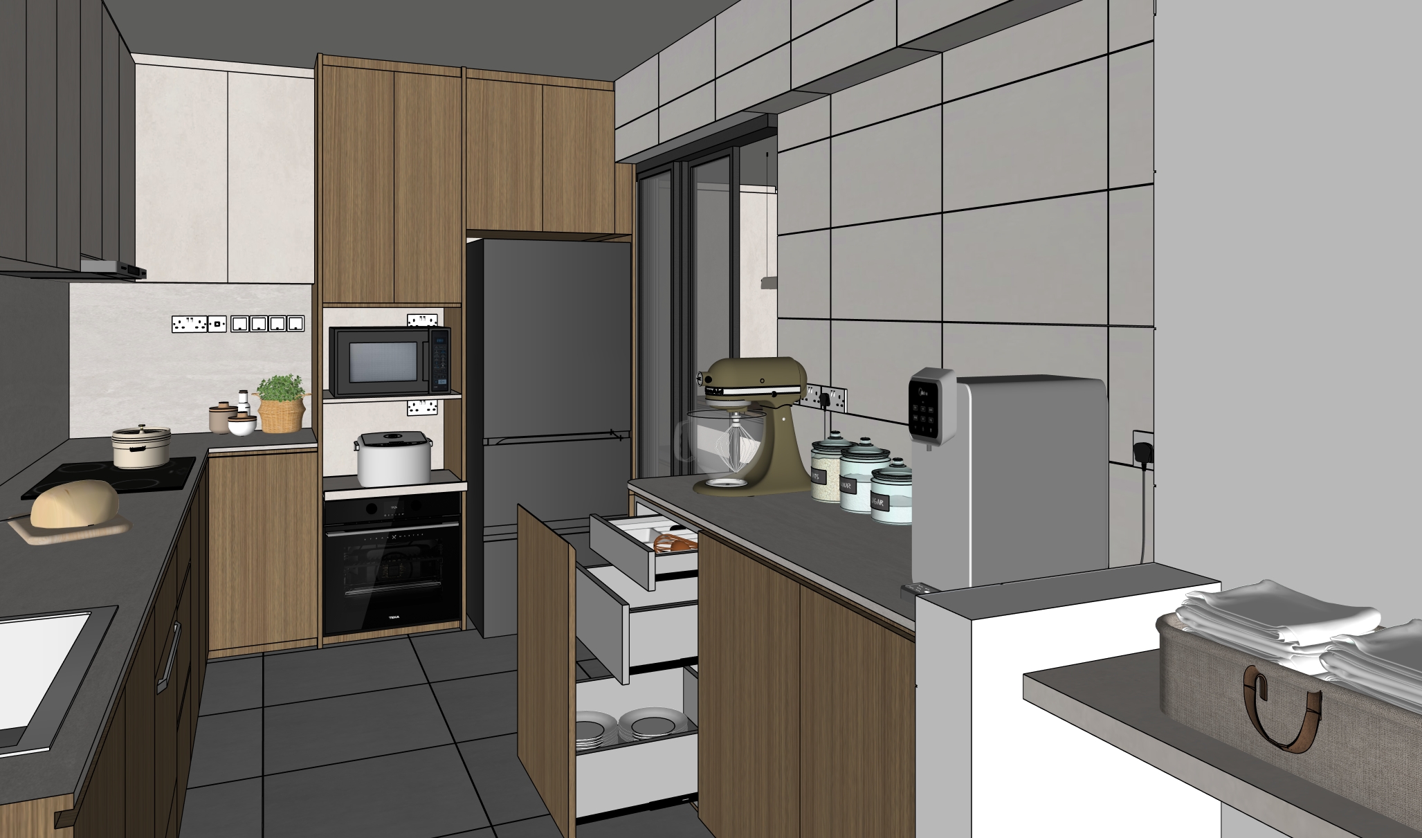 make the wood colour and texture less grains accurate the countertop is travertine less texture the top hung cabinets are light microcement