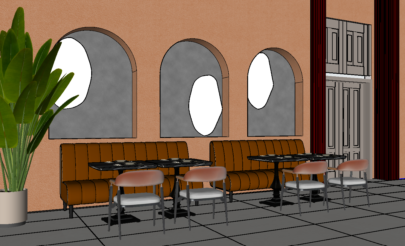 inside the arches there is an asymmetrical antique mirror in the shape of the arch the walls are painted with decorative plaster the inside of the arches are gray the outer walls are salmon colored all arches have led lighting