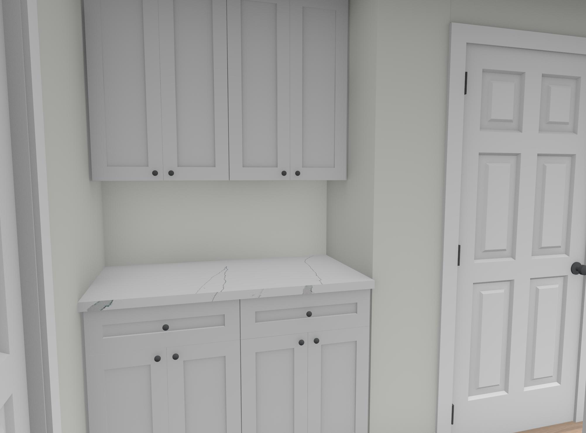add a calacatta countertop that extends as backsplash up to the wall cabinets add brass hardware and make cabinets green