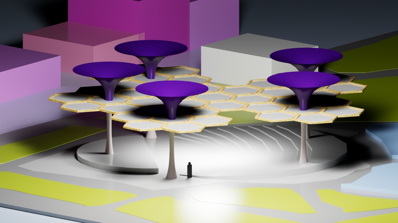 make a green roof con top of the hexagonal shapes wich play as a roof for an outdoor auditorium very connected to nature pink boxes are 4 story apartment building barroque style green is grass and blue is water