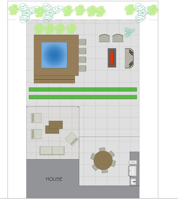 create a highly detailed photorealistic 3d render of an outdoor area based on the uploaded floor plan and reference photo layout and materials existing house marked in red on the plan should appear as a gray structure light gray brick paver in large rectangular pieces for all areas marked in orange synthetic grass strips for areas marked in green hot tub square marked in blue for 6 people surrounded by a brown wooden deck existing lanai on the right side of the house with a round wooden dining table and 6 chairs inside pergola on the left side of the lanai with a flat roof and wooden ceiling under the pergola place a modern stylish living room with contemporary seating and furniture in front of the pergola include the hot tub and its surrounding wooden deck right side of the deck small bar style table with stools next to the hot tub in front of the existing lanai modern lounge area with a contemporary fire pit behind the spa deck several modern planters with plants potted palm tree in a modern planter in the right corner near the fire pit ensure realistic lighting shadows textures and modern design aesthetics pay close attention to proportions materials and finishes to match the uploaded reference photo
